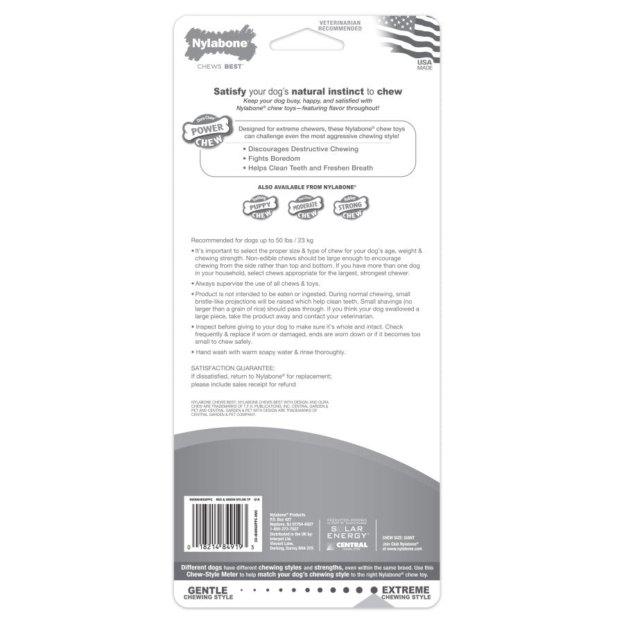 Seeking the best presents for dogs this holiday season? Reward your best friend for making the nice list with our Power Chew Holiday Twin Pack! This festive bundle includes two fun nylon bones, a green chew toy with refreshing wintergreen flavor, and a red chew toy with savory turkey and cranberry flavor. Designed for extreme chewers, these durable chew toys will satisfy your dog's natural instinct to chew and promote healthy, non-destructive behavior. Like all of our long lasting chew toys, these bones provide ongoing entertainment and keep boredom at bay. Plus, they help clean teeth and freshen breath as your dog chews to promote dental health. These large dog chew toys are recommended for dogs up to 50 pounds and are proudly made in the USA! What your dog chews matters! With destructive behavior among the leading reasons dogs are returned to shelters, we know healthy habits can make a life-changing difference. For 70 years, our family-founded brand continues to safely satisfy dogs’ chewing instincts and help them stay in loving forever homes!