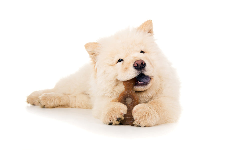 Help your puppy get started on the right paw by establishing healthy chewing habits right from the start! Our Puppy Ring Bone chew toy is made with soft, puppy-friendly material to satisfy the chewing needs of teething pups and encourage positive chewing habits from a young age. With savory chicken flavor throughout, pups will stay occupied and happy. Plus, this puppy teething toy features ridges and nubs that help reduce plaque and tartar buildup as pup chew. This puppy teething ring is not for puppies with adult teeth or for powerful chewers. This chew is the perfect toy to comfort your teething puppy! What your dog chews matters! With destructive behavior among the leading reasons dogs are returned to shelters, we know healthy habits can make a life-changing difference. For 70 years, our family-founded brand continues to safely satisfy dogs’ chewing instincts and help them stay in loving forever homes!