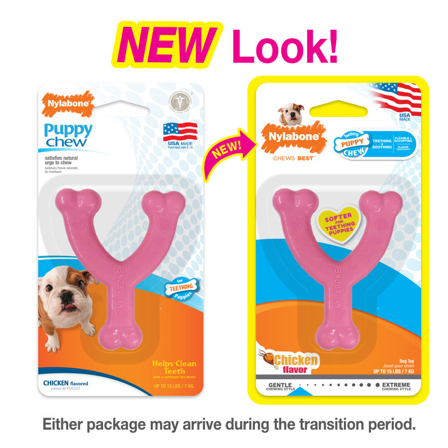 Made specially for growing pups, the Puppy Chew Wishbone will encourage positive chewing habits that last a lifetime. This puppy chew toy features flavor throughout, bright engaging colors, and 3 exciting chewing ends designed to keep your new best friend busy and entertained. It is made of softer puppy-friendly material for dogs without adult teeth, making this the perfect chew toy for teething puppies. Plus, it helps clean teeth through chewing action and can even be frozen to help soothe gums. Satisfy your pup's natural urge to chew with this classic USA-made chew toy! What your dog chews matters! With destructive behavior among the leading reasons dogs are returned to shelters, we know healthy habits can make a life-changing difference. For 70 years, our family-founded brand continues to safely satisfy dogs’ chewing instincts and help them stay in loving forever homes!