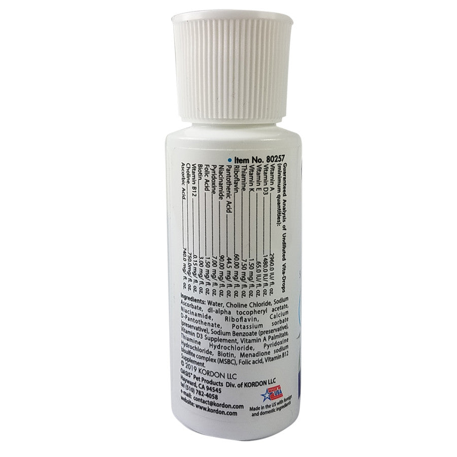 - Ingredients: Water; Choline Chloride; Sodium Ascorbate; d-a-Alpha Tocopherol Acetate; Niacinamide; Riboflavin; Dl-Pantothenic Acid; Potassium Sorbate (Preservative); Sodium Benzoate (Preservative); Vitamin D3 Supplement; Vitamin A Palmitate; Thiamine Hydrochloride; Pyridoxine Hydrochloride; Biotin; Menadione Sodium Bisulfate Complex (MSBC); Folic acid; Vitamin B12 SupplementGuaranteed Analysis per Fluid Ounce (28.3 gr) of undiluted Vita-Drops (minimum quantites):Vitamin A - 2960 IUVitamin D3 - 1480 IUVitamin E - 65 IUMenadione (Vitamin K) - 1.50 mgThiamine(Vitamin B1) - 7.50 mgRiboflavin (Vitamin B2) - 60.00 mgD-Panthothenic Acid - 44.50 mgNiacin - 90.00 mgPyridoxine (Vitamin B6) - 7.00 mgFolic Acid - 1.50 mgBiotin - 3.00 mgVitamin B12 - 0.15 mgCholine - 750 mgAscorbic Acid (Vitamin C) - 740 mg