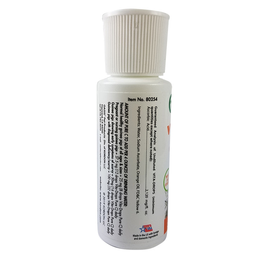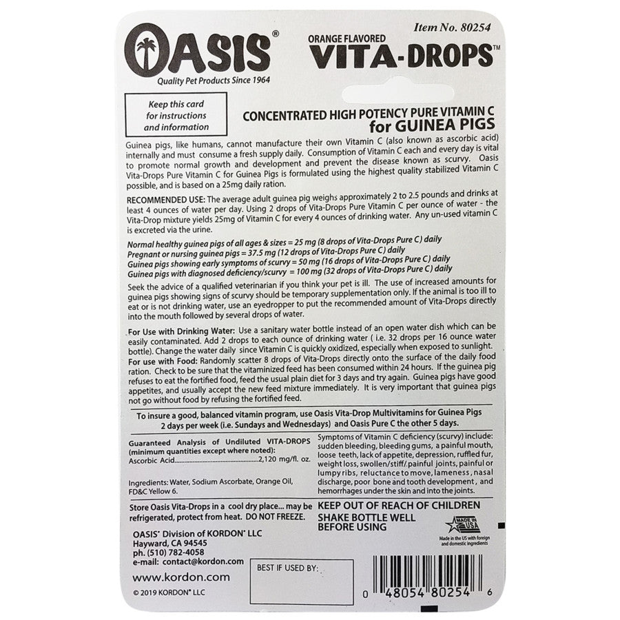 - Use Instructions: Oasis Vita-Drops Pure C can be added to the food or the drinking water, whichever is more appropriate and accepted by the guinea pig. The preferred method of using OASIS VITA-DROPS Pure C is to add the concentrated liquid supplement to the guinea pig's daily drinking water (whenever possible, use a sanitary water bottle instead of an open water dish, which can be easily contaminated with debris). Guinea pigs readily drink this mixture, but if desired the vitamins may be applied directly to their food. Recommended Doses: The average adult guinea pig weighs approximately 2 to 2.5 pounds and drinks 4 ounces of water per day. At this rate - using 2 drops of Vita-Drops Pure Vitamin C per ounce of water - the Vita-Drop mixture yields 25 mg of Vitamin C. Any unused vitamin C is excreted via the urine.Normal healthy guinea pigs of all ages & sizes = 25 mg (8 drops of Vita-Drops Pure C) dailyPregnant or nursing guinea pigs = 37.5 mg (12 drops of Vita-Drops Pure C) dailyGuinea pigs showing signs of stress or scurvy = 50 mg (16 drops of Vita-Drops Pure C) dailyMega-dose for guinea pigs with deficiency/scurvy = 100 mg (32 drops of Vita-Drops Pure C) dailyFor use with food: Randomly scatter 8 drops of Vita-Drops directly onto the surface of the daily food ration. Check to be sure that the vitamized feed has been consumed within 24 hours. If the guinea pig refuses to eat the fortified food, feed the usual plain diet for 3 days and try again. Guinea pigs have good appetites, and usually accept the new feed mixture immediately. It is very important that guinea pigs not go without food by refusing the fortified feed. Excess dosages should cause no ill effect.
