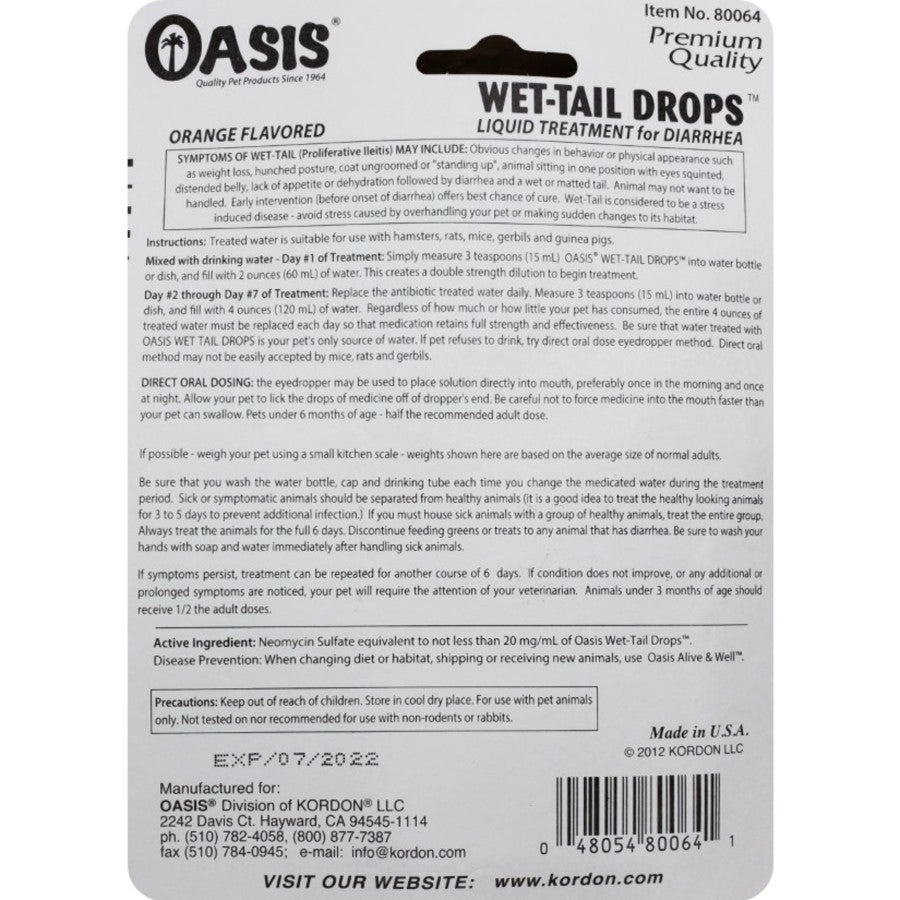 - Use Instructions: Treated water is suitable for use with hamsters, rats, mice, gerbils and guinea pigs.Mixed with drinking water - Day #1 of Treatment: Simply measure 3 teaspoons (15 mL) OASIS® WET-TAIL DROPS™ into water bottle or dish, and fill with 2 ounces (60 mL) of water. This creates a double strength dilution to begin treatment.Day #2 through Day #7 of Treatment: Replace the antibiotic treated water daily. Measure 3 teaspoons (15 mL) into water bottle or dish, and fill with 4 ounces (120 mL) of water. Regardless of how much or how little your pet has consumed, the entire 4 ounces of treated water must be replaced each day so that medication retains full strength and effectiveness. Be sure that water treated with OASIS WET TAIL DROPS is your pet's only source of water. If pet refuses to drink, try direct oral dose eyedropper method.Direct Oral Dosing: the eyedropper may be used to place solution directly into mouth, preferably once in the morning and once at night. Allow your pet to lick the drops of medicine off of dropper's end. Be careful not to force medicine into the mouth faster than your pet can swallow. Pets under 6 months of age - half the recommended adult dose. Direct oral method may not be easily accepted by mice, rats and gerbils.For Siberian Hamster weighs 1 oz (25-35g), use 8 drops (1/4 mL) once daily;For Chinese Hamster weighs 1 1/2 oz (30-50g), use 8 drops (1/4 mL) once daily;For Golden Hamster weighs 4-5 oz (110-140g),use 16 drops (1/2 mL) once daily;For Guinea Pig (cavy) weighs 2-2 1/2 lbs (800-1200g), use 24 drops (3/4 mL) once daily. If possible - weigh your pet using a small kitchen scale - weights shown here are based on the average size of normal adults. Be sure that you wash the water bottle, cap and drinking tube each time you change the medicated water during the treatment period. Sick or symptomatic animals should be separated from healthy animals (it is a good idea to treat the healthy looking animals for 3 to 5 days to prevent additional infection.) If you must house sick animals with a group of healthy animals, treat the entire group. Always treat the animals for the full 6 days. Discontinue feeding greens or treats to any animal that has diarrhea. Be sure to wash your hands with soap and water immediately after handling sick animals.