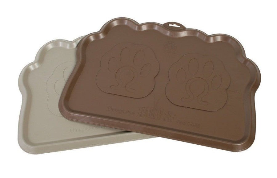 The uniquely shaped paw mats have been designed with a raised edge to prevent food or water from spilling onto the floor.