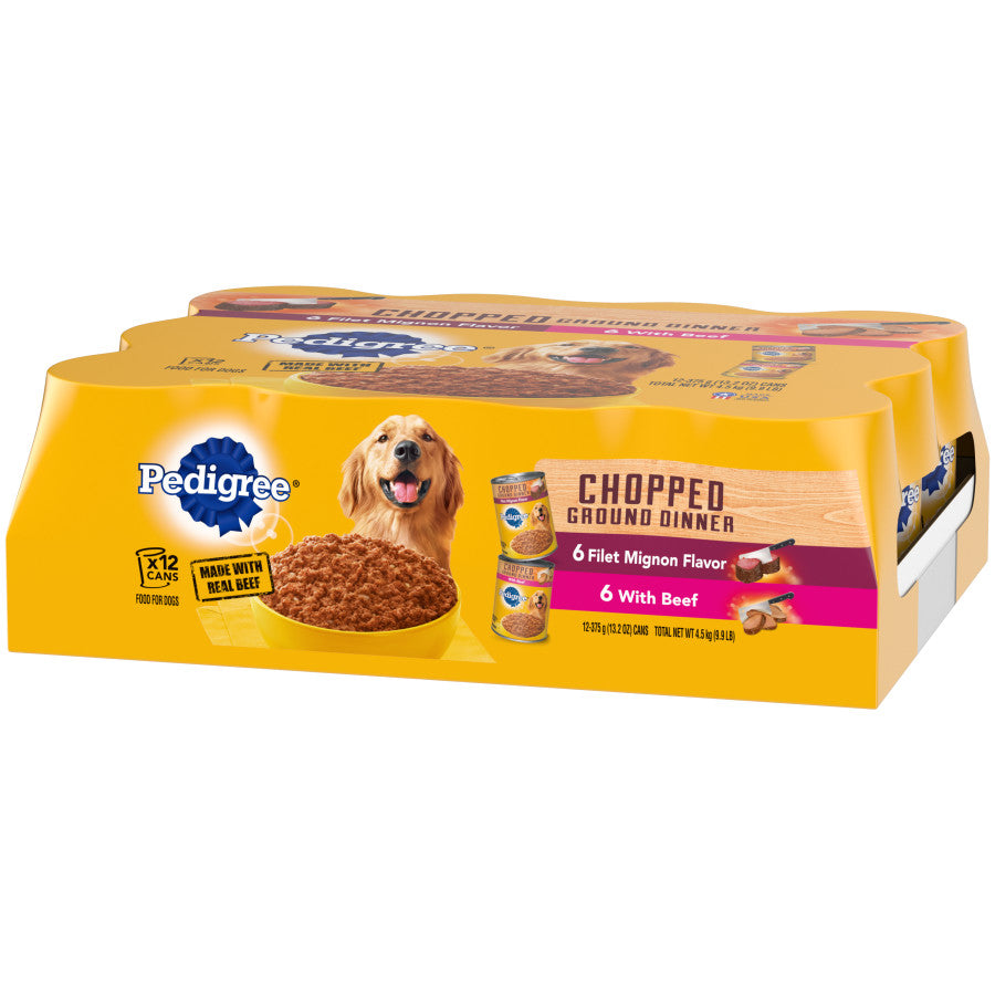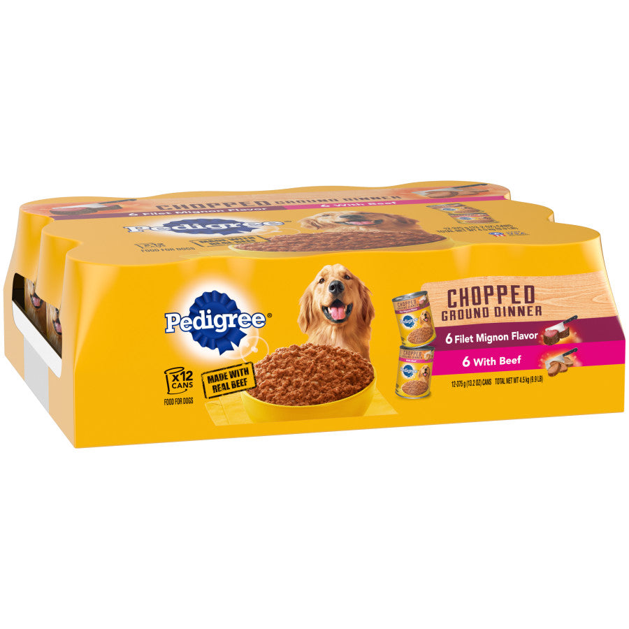 - Contains twelve (12) 13.2 oz. cans of PEDIGREE CHOPPED GROUND DINNER Canned Soft Wet Dog Food Variety Pack: (6) Filet Mignon Flavor, (6) with Beef