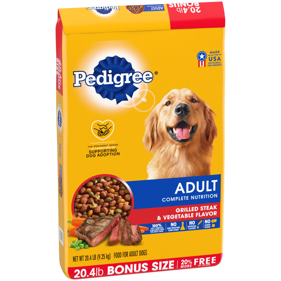 - Contains one (1) 20.4 lb. bag of PEDIGREE Complete Nutrition Adult Dry Dog Food, Grilled Steak & Vegetable Flavor