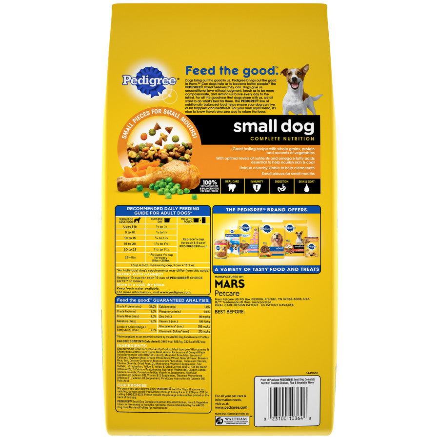 Even little dogs need a large amount of nutrition. That's why every bag of PEDIGREE Small Dog Roasted Chicken, Rice & Vegetable Flavor Dry Dog Food has the vitamins and minerals small breed dogs need to be healthy and happy. Made with high quality whole grains, protein and omega-6 fatty acids, PEDIGREE Small Dog Food helps your canine look and feel their best. Best of all, our oral care kibble gently cleans their teeth with every bite. Now with no high fructose corn syrup, no artificial flavors, and no added sugar.