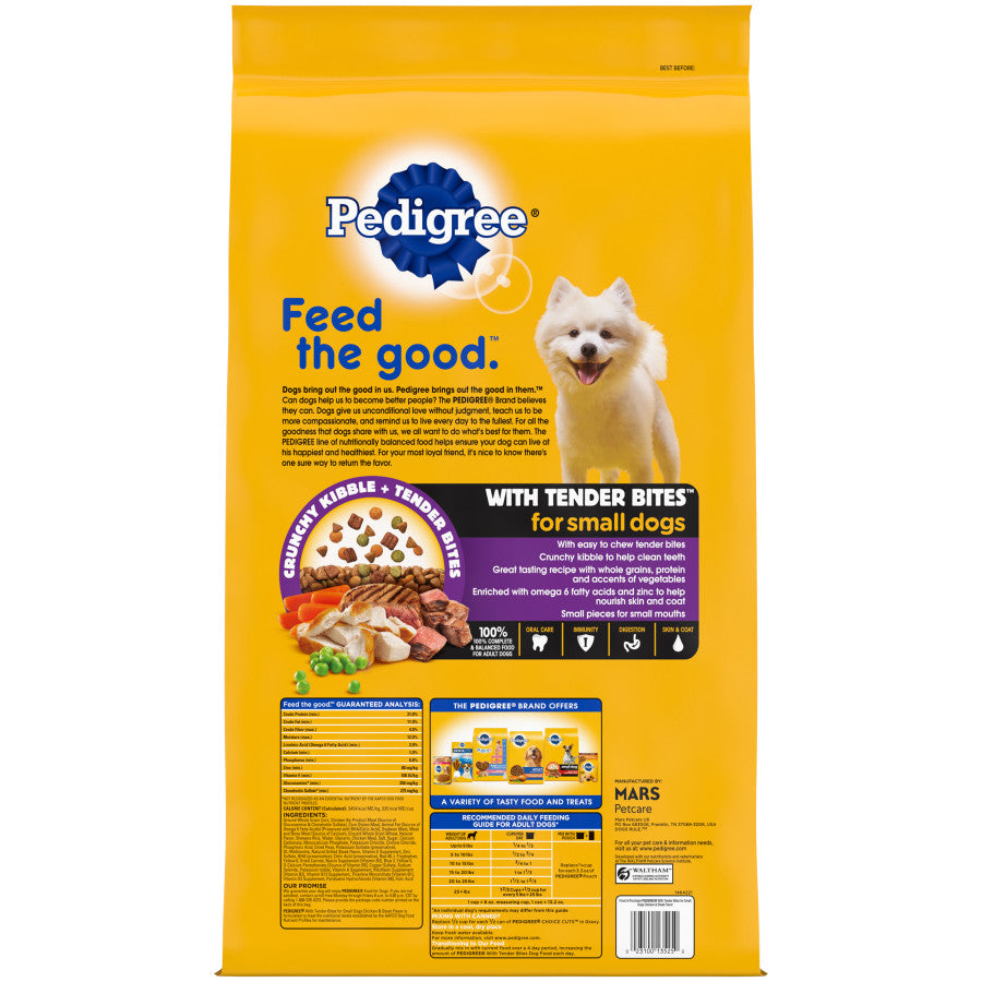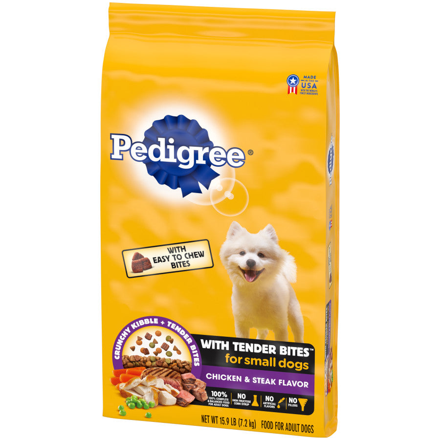 - Contains one (1) 15.9 lb. bag of PEDIGREE with Tender Bites Complete Nutrition Adult Small Breed Dry Dog Food, Chicken & Steak Flavor