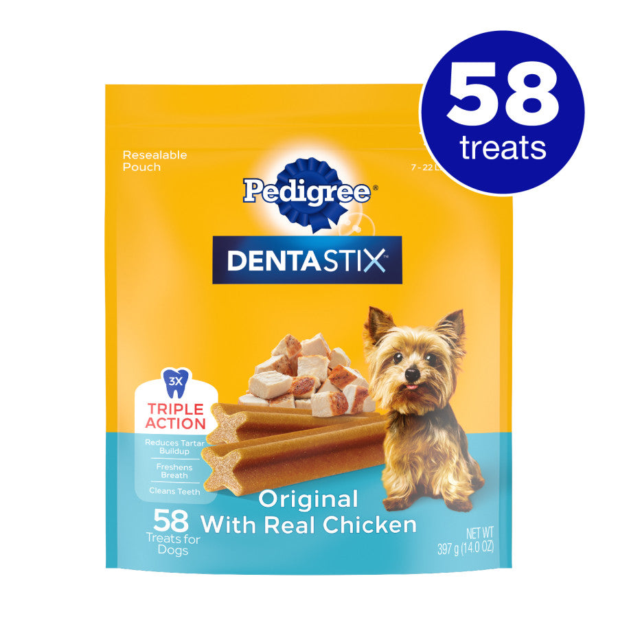 Refresh your dog's dental care routine with PEDIGREE DENTASTIX. Our chews have a special chewy texture and provide daily oral care by helping to clean between teeth and down to the gumline. These PEDIGREE DENTASTIX Dental Treats are also clinically proven to reduce tartar buildup. Best of all, our patented X-shaped chews freshen breath while treating your dog to better oral health and dental care. PEDIGREE Oral Care Treats are dog snacks you can trust, and your dog will love.