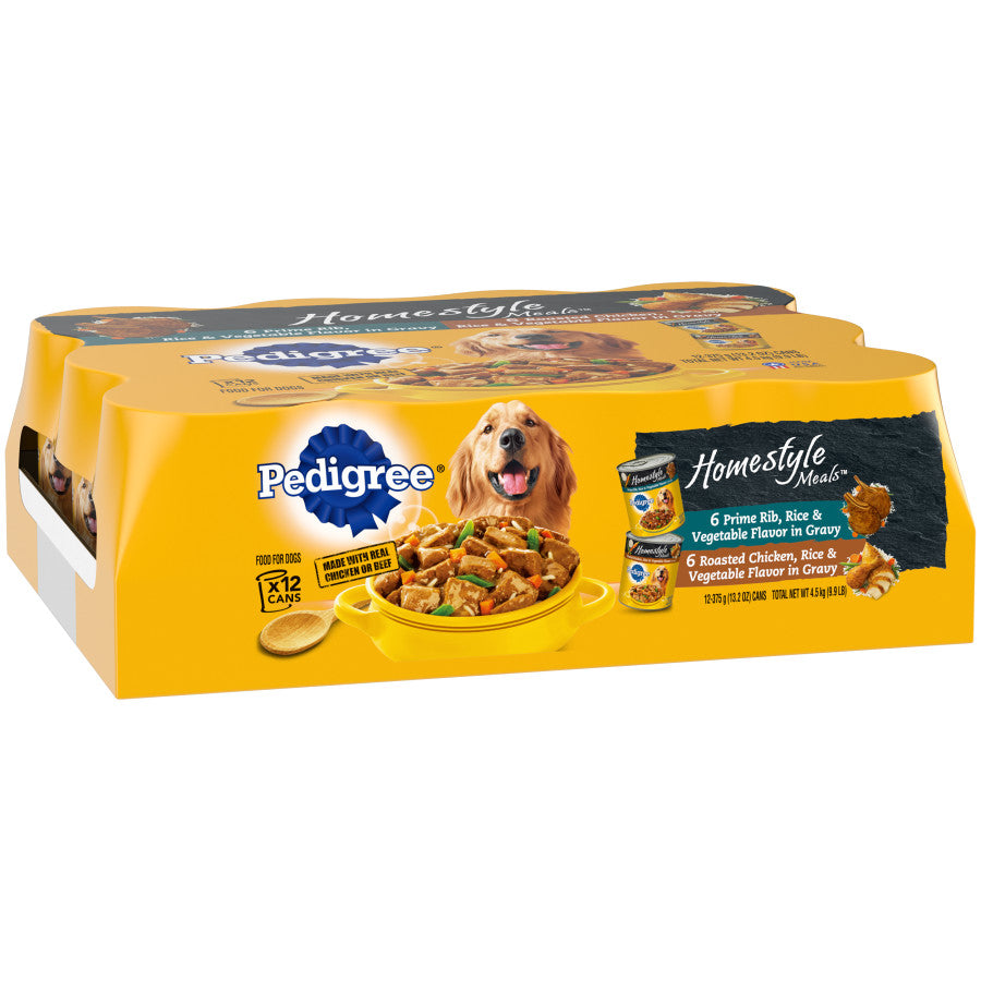- Contains twelve (12) 13.2 oz. cans of PEDIGREE Homestyle Meals Canned Wet Dog Food Variety Pack: (6) Prime Rib, Rice, & Vegetable Flavor in Gravy and (6) Roasted Chicken, Rice, & Vegetable Flavor in Gravy