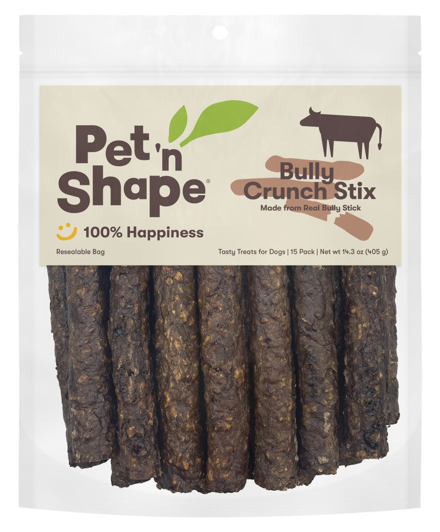 Your paw-tner will go head over paws for Pet 'n Shape Bully Crunch Stix! Made with just 2 ingredients - real beefhide and beef pizzle - these naturally delicious dog treats are low in fat and packed with a ton of protein and flavor. As your dog chews, the texture helps scrape away plaque and tartar - supporting healthy teeth and gums!