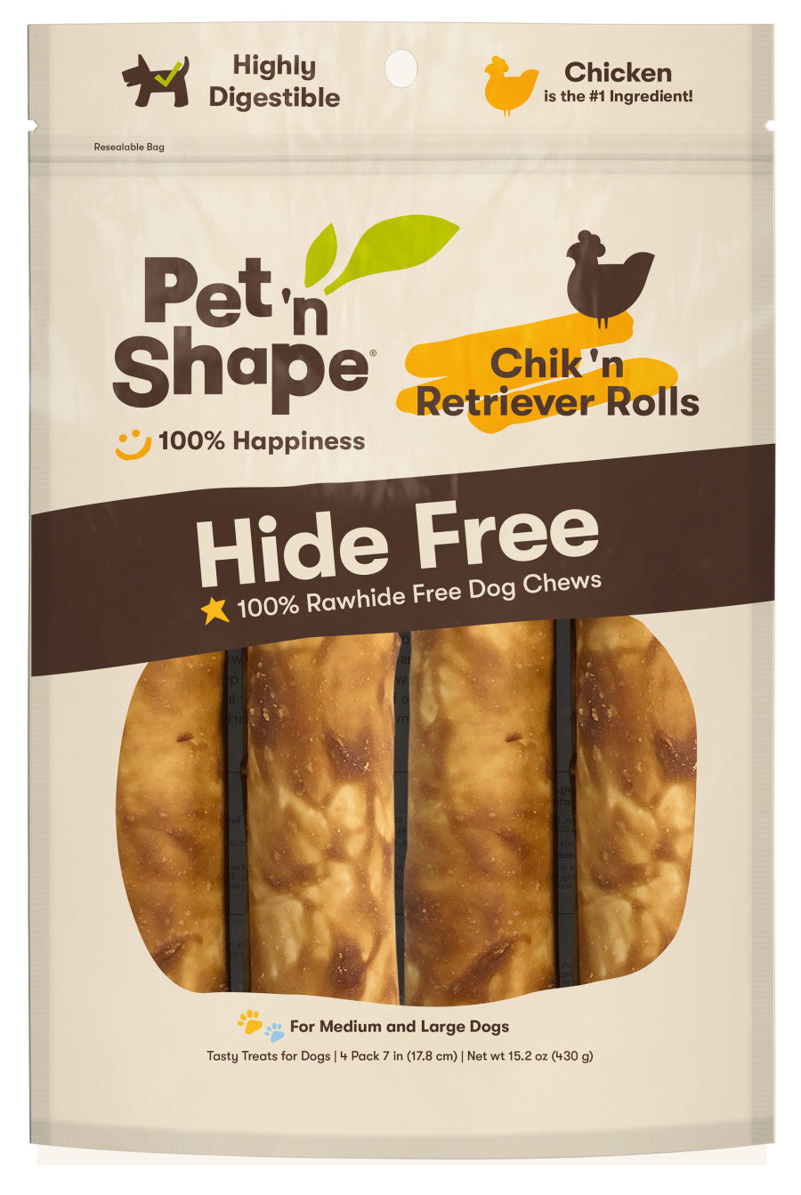 Treat your furry family member to a hide free chew built for taste with Pet 'n Shape Hide-Free Chik'n Retriever Rolls dog treats! These naturally delicious treats up the game with chicken as the #1 ingredient. Each treat is individually hand rolled and crafted with premium ingredients, including real, high-quality chicken. Designed to give your pup more of what you want and less of what you don't, these chews don’t contain preservatives or grains.