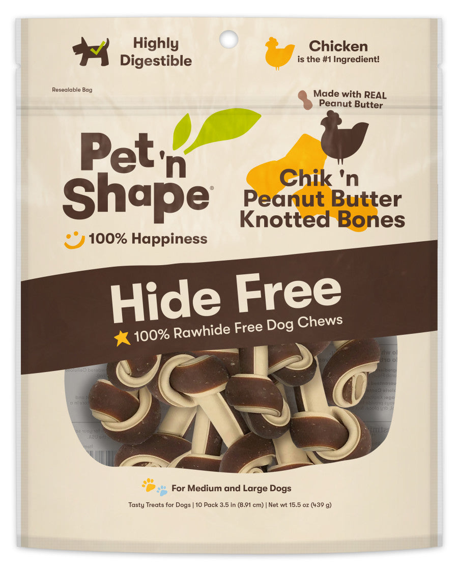Treat your furry family member to a hide free chew built for taste with Pet 'n Shape Hide-Free Two-Tone Chik'n Knot Bones with Real Peanut Butter dog treats! These naturally delicious treats are individually knotted and are made with real chicken and peanut butter. Each treat is designed to give your pup more of what you want and less of what you don't, these chews don’t contain preservatives or grains.