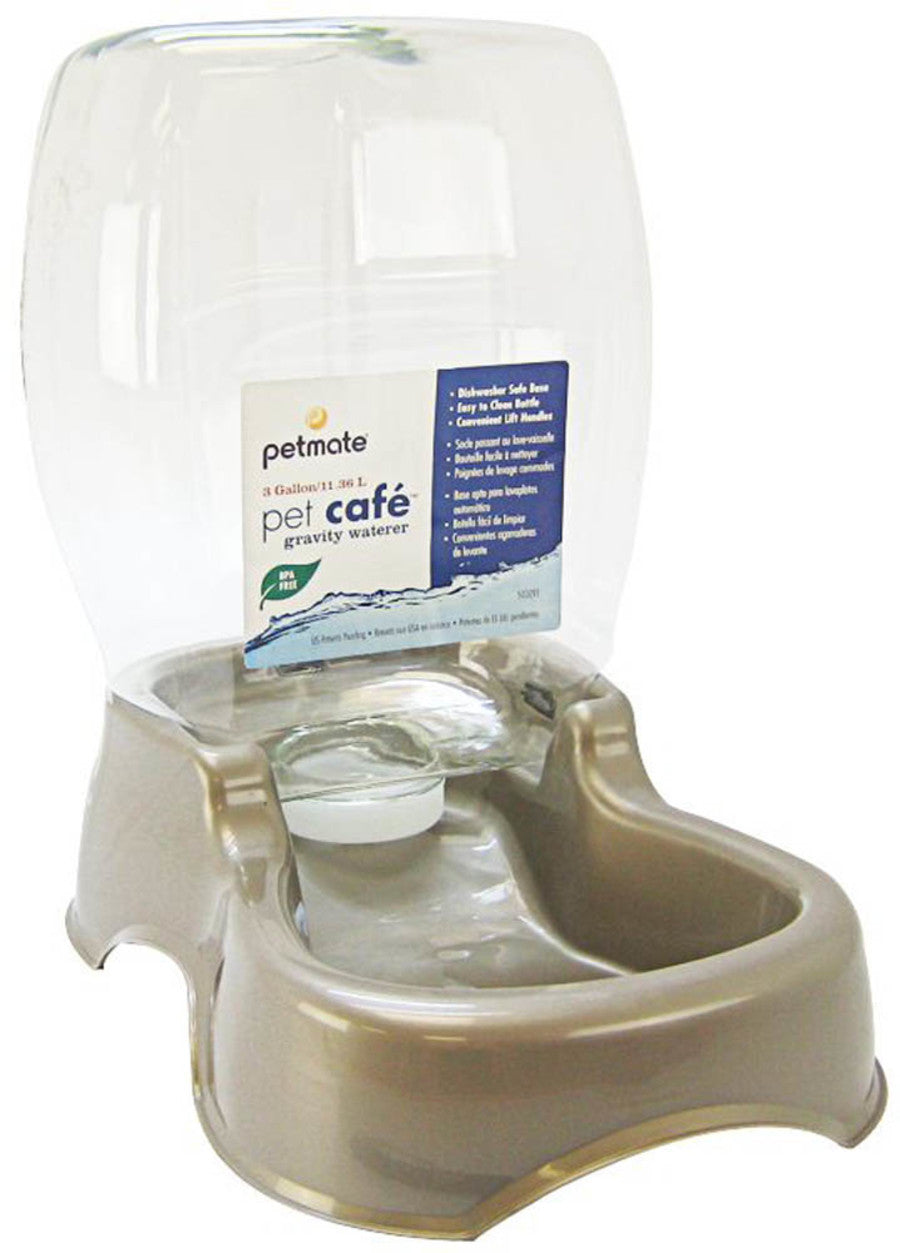 The Petmate® Pet Café Waterer simplifies your life while enhancing the life of your pet. Featuring an automatic gravity design that keeps your pet hydrated by replenishing your pet's water supply. The eco-friendly water hopper automatically fills the water reservoir when levels get low and features a large water dispensing hole making the bottle easy-to-clean. The Pet Café's fashionable base features easy-grab cutouts making the Waterer easy to maneuver and comes in a variety of colors to complement any home decor. Constructed using more environmentally sustainable PET vs. PVC bottles. Pet parents choose from an assortment of sizes. Made in the USA.