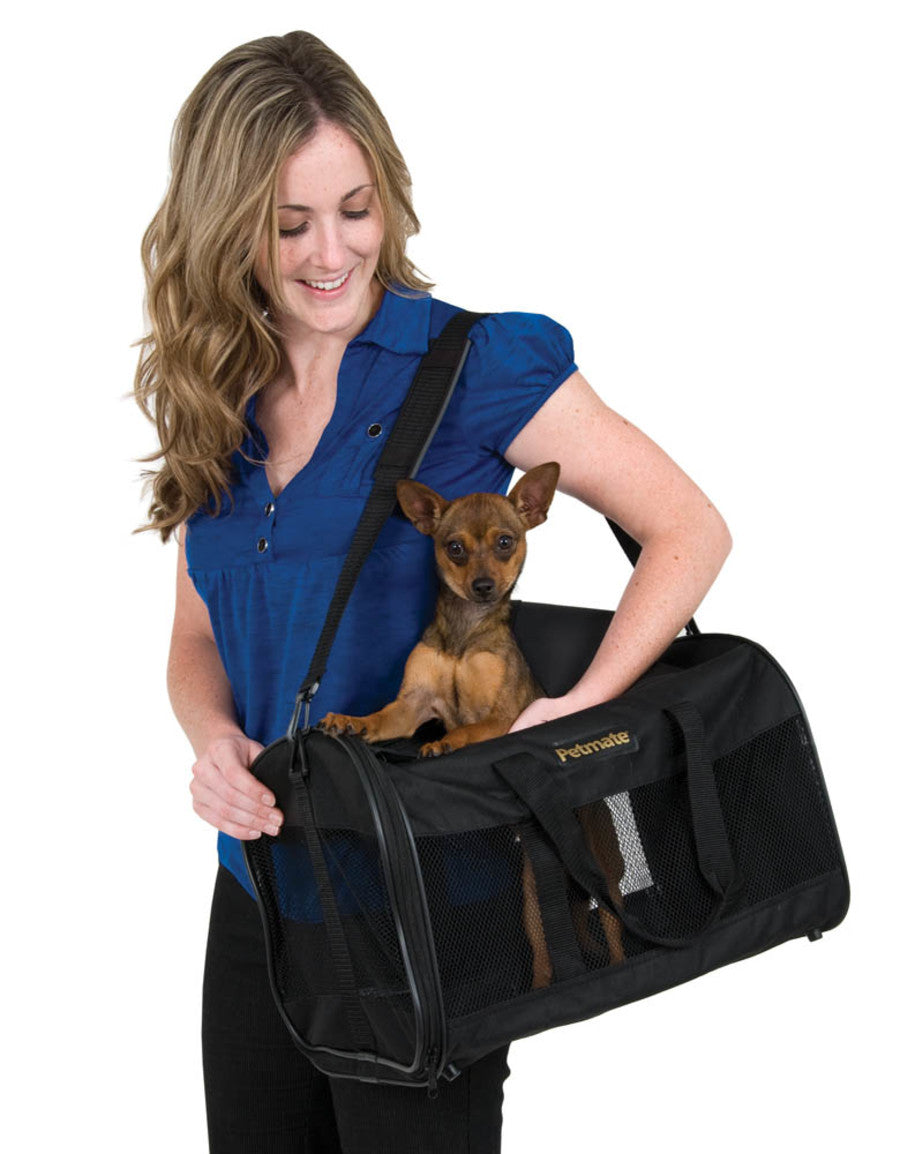 You & your pet will travel in style with a Petmate® Soft Sided Kennel Cab. Perfect for general or in-cabin airline travel. Features a two-door design for both top & front loading, mesh walls to promote healthy air flow, a convenient carrying handle, & comfortable shoulder strap. Made of a quality durable material with PVC backing. The exterior rear pocket allows you to bring all your pet's essentials. Meets most in-cabin airline requirements*. Pet parents should always confirm the air travel requirements of the specific airline in advance of each trip.