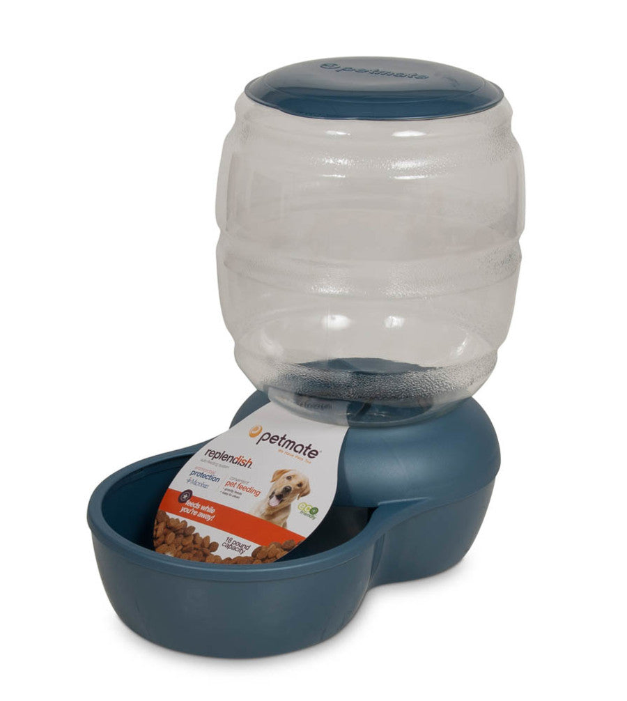 The Petmate® Replendish® Feeder with Microban® simplifies life by providing a continuous flow of top load food so busy pet parents have fewer refills to make. This gravity-controlled feeder automatically lets food drop into the bowl to keep your dog or cat fed. Ideal for short stays away from home or multiple pet households. Made with PET plastic making it safe for your pet. The base features Microban Antimicrobial Protection that helps prevent the growth of stain and odor-causing bacteria. This protection provides an additional level of defense against damaging microbes. Easy to clean wide mouth bottle. Made in the USA.