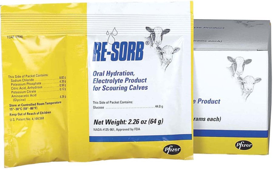 - Benefits: 1. RE-SORB rapidly replenishes lost electrolytes and fluids in the scouring calf2. RE-SORB is isotonic approximately the same concentration of electrolytes as body fluid resulting in rapid and efficient absorption3. Contains glycine and citrate for improved uptake of electrolytes4. Provides useful follow-up treatment after intravenous fluid therapy5. Supplied in individual packets for precise dosing, no waste6. Easy to mix, dissolves rapidly and stays in solution7. Palatable formula tastes good, avoids stress of tube feeding8. Oral dosing permits fluid replacement at first signs of scours
