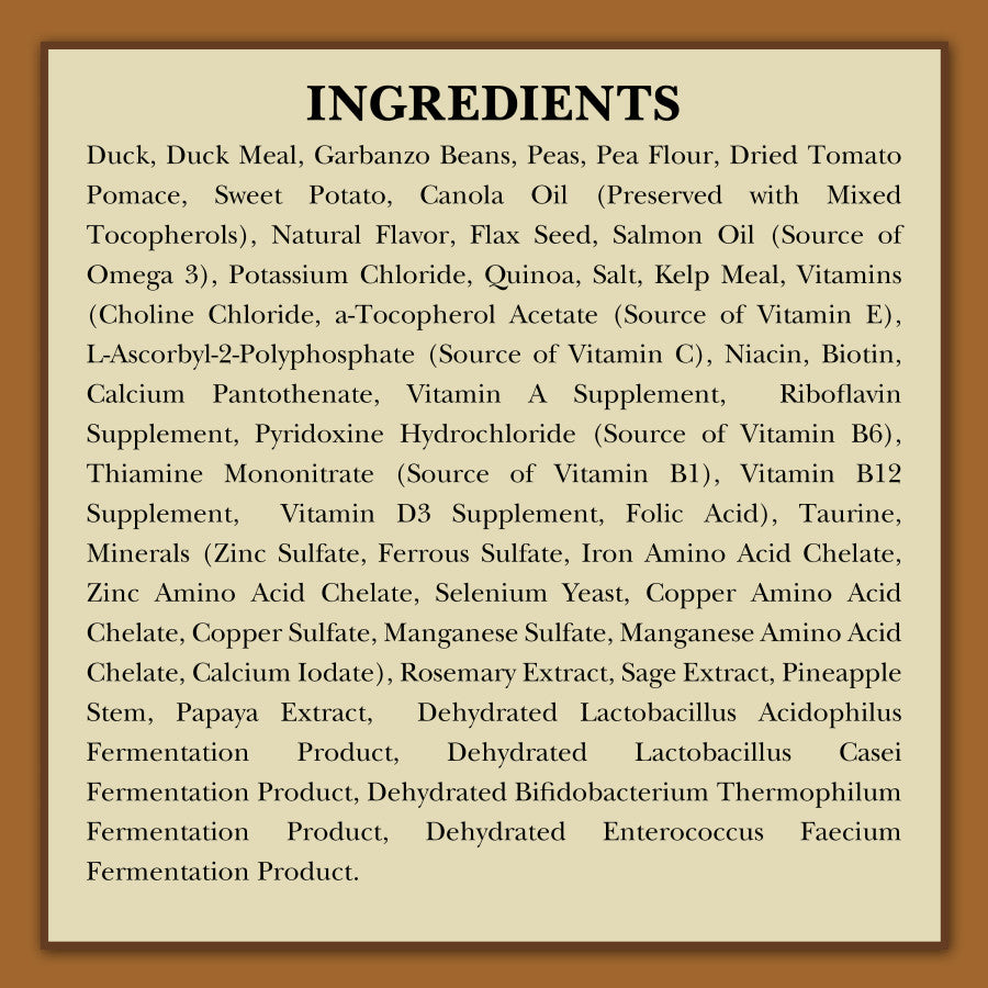 - Ingredients: Duck, Duck Meal, Garbanzo Beans, Peas, Pea Flour, Dried Tomato Pomace, Sweet Potato, Canola Oil (Preserved with Mixed Tocopherols), Natural Flavor, Flax Seed, Salmon Oil (Source of Omega 3), Potassium Chloride, Quinoa Seed, Salt, Kelp Meal, Vitamins (Choline Chloride, a-Tocopherol Acetate (Source of Vitamin E), L-Ascorbyl-2-Polyphosphate (Source of Vitamin C), Niacin, Biotin, Calcium Pantothenate, Vitamin A Supplement, Riboflavin Supplement, Pyridoxine Hydrochloride (Source of Vitamin B6), Thiamine Mononitrate (Source of Vitamin B1), Vitamin B12 Supplement, Vitamin D3 Supplement, Folic Acid), Taurine, Minerals (Zinc Sulfate, Ferrous Sulfate, Iron Amino Acid Chelate, Zinc Amino Acid Chelate, Selenium Yeast, Copper Amino Acid Chelate, Copper Sulfate, Manganese Sulfate, Manganese Amino Acid Chelate, Calcium Iodate), Rosemary Extract, Sage Extract, Pineapple Stem, Papaya Extract, Dehydrated Lactobacillus Acidophilus Fermentation Product, Dehydrated Lactobacillus Casei Fermentation Product, Dehydrated Bifidobacterium Thermophilum Fermentation Product, Dehydrated Enterococcus Faecium Fermentation Product.