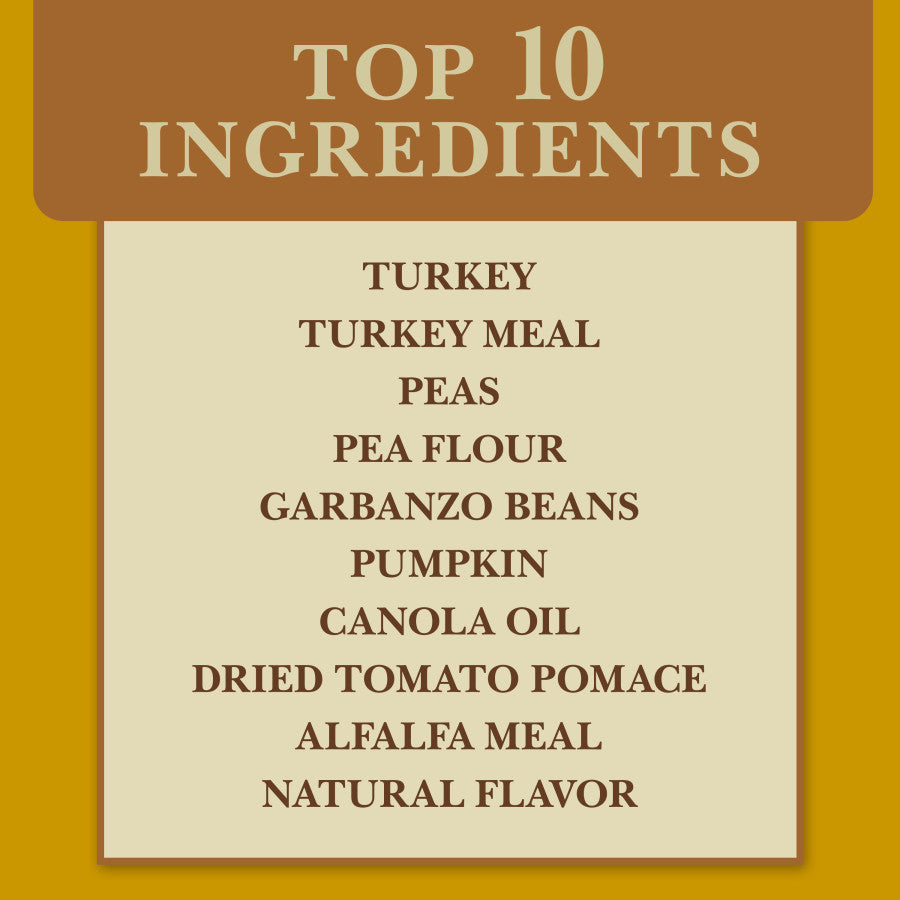 - Ingredients: Turkey, Turkey Meal, Peas, Pea Flour, Garbanzo Beans, Pumpkin, Canola Oil (Preserved with Mixed Tocopherols), Dried Tomato Pomace, Alfalfa Meal, Natural Flavor, Flax Seed, Salmon Oil (Source of Omega 3), Potassium Chloride, Quinoa Seed, Salt, Kelp Meal, Vitamins (Choline Chloride, a-Tocopherol Acetate (Source of Vitamin E), L-Ascorbyl-2-Polyphosphate (Source of Vitamin C), Niacin, Biotin, Calcium Pantothenate, Vitamin A Supplement, Riboflavin Supplement, Pyridoxine Hydrochloride (Source of Vitamin B6), Thiamine Mononitrate (Source of Vitamin B1), Vitamin B12 Supplement, Vitamin D3 Supplement, Folic Acid), Taurine, Minerals (Zinc Sulfate, Ferrous Sulfate, Iron Amino Acid Chelate, Zinc Amino Acid Chelate, Selenium Yeast, Copper Amino Acid Chelate, Copper Sulfate, Manganese Sulfate, Manganese Amino Acid Chelate, Calcium Iodate), Rosemary Extract, Sage Extract, Pineapple Stem, Papaya Extract, Dehydrated Lactobacillus Acidophilus Fermentation Product, Dehydrated Lactobacillus Casei Fermentation Product, Dehydrated Bifidobacterium Thermophilum Fermentation Product, Dehydrated Enterococcus Faecium Fermentation Product.