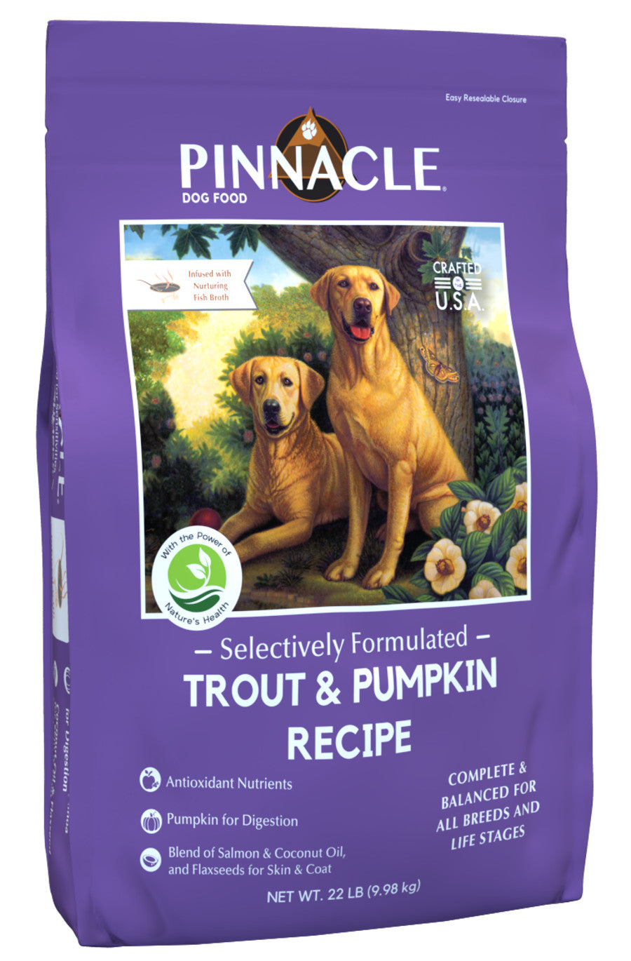 Pinnacle Trout and Pumpkin recipe is selectively formulated to to be the best nutrition for your dog, made with the power of nature's health. Slow cooked in small batches for optimum nutrition and savory flavor, and infused with healthful fish broth. Premium trout is first, with an antioxidant rich blend of chia, flax, and pumpkin seeds, salmon and coconut oil, plus a superfood blend of vegetables and fruits. Complete and balanced for all lifestages.