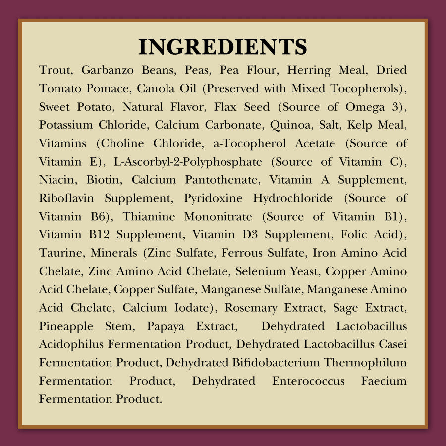 - Ingredients: Trout, Garbanzo Beans, Peas, Pea Flour, Herring Meal, Dried Tomato Pomace, Canola Oil (Preserved with Mixed Tocopherols), Sweet Potato, Natural Flavor, Flax Seed (Source of Omega 3), Potassium Chloride, Calcium Carbonate, Quinoa Seed, Salt, Kelp Meal, Vitamins (Choline Chloride, a-Tocopherol Acetate (Source of Vitamin E), L-Ascorbyl-2-Polyphosphate (Source of Vitamin C), Niacin, Biotin, Calcium Pantothenate, Vitamin A Supplement, Riboflavin Supplement, Pyridoxine Hydrochloride (Source of Vitamin B6), Thiamine Mononitrate (Source of Vitamin B1), Vitamin B12 Supplement, Vitamin D3 Supplement, Folic Acid), Taurine, Minerals (Zinc Sulfate, Ferrous Sulfate, Iron Amino Acid Chelate, Zinc Amino Acid Chelate, Selenium Yeast, Copper Amino Acid Chelate, Copper Sulfate, Manganese Sulfate, Manganese Amino Acid Chelate, Calcium Iodate), Rosemary Extract, Sage Extract, Pineapple Stem, Papaya Extract, Dehydrated Lactobacillus Acidophilus Fermentation Product, Dehydrated Lactobacillus Casei Fermentation Product, Dehydrated Bifidobacterium Thermophilum Fermentation Product, Dehydrated Enterococcus Faecium Fermentation Product.