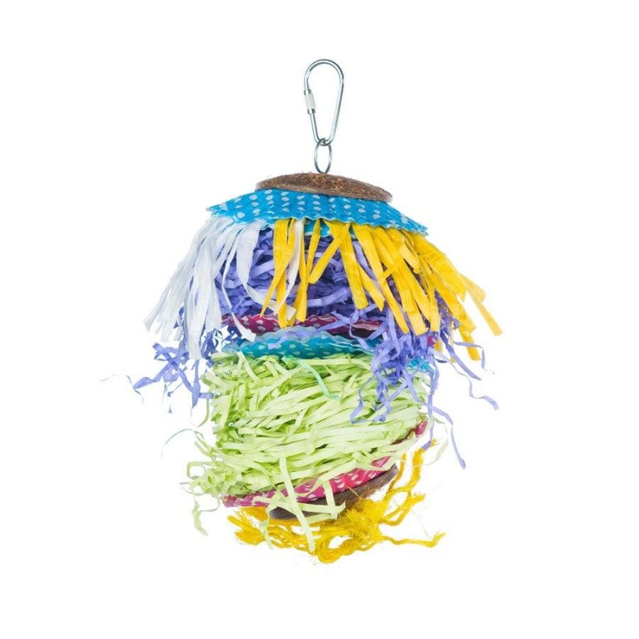 Prevue Pet Products Barn Dance 62675 is a colorful, dangling pull toy designed for satisfying preening instincts and discouraging plucking in your bird. Our Barn Dance toy is made from an assortment of Sisal Ropes and multicolored paper, providing your bird with mental stimulation and hours of fun. The coconut shell is perfect for beak and tongue exercise. All materials are 100% pet safe with non-toxic, food-grade colors and connect easily to cage with stainless steel quick-link attachments– actual measurements may vary slightly. As always, supervise birds at play. Our Bance Dance toy measures 5 diameter and 6 1/2 high. Ideal for x-small, small, and medium birds measuring 4 to 18 beak to tail.