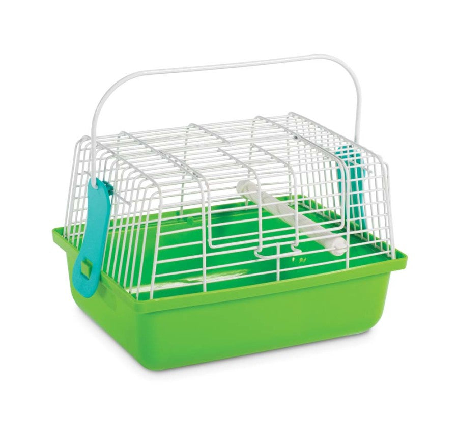 Prevue Pet Products Travel bird/ small animal cage is a compact carry bird cage for small birds and small animals. Our bird/small cage features a large top-opening door and convenient carry handle. Our bird/small animal cage includes a removable plastic perch which can be taken out if used for transporting small animals such as hamsters or gerbils. Measures: 9 Long, 5 5/8 Wide and 6 1/8 High with 3/8 wire spacing. Base alone is 2 7/8 deep.