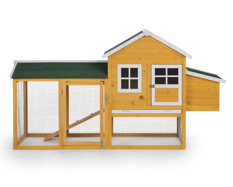 This adorable coop is compact yet roomy. The elevated coop allows hens full use of the enclosed chicken run. The coop interior features a removeable floor tray for routine cleaning, two roosting bars, and full access to the 2-bay nest box. An interior coop divider door can be closed from the exterior with a jointed handle. Two access doors with barrel bolt locks and a lock-ready nest box lid allow access to all areas
