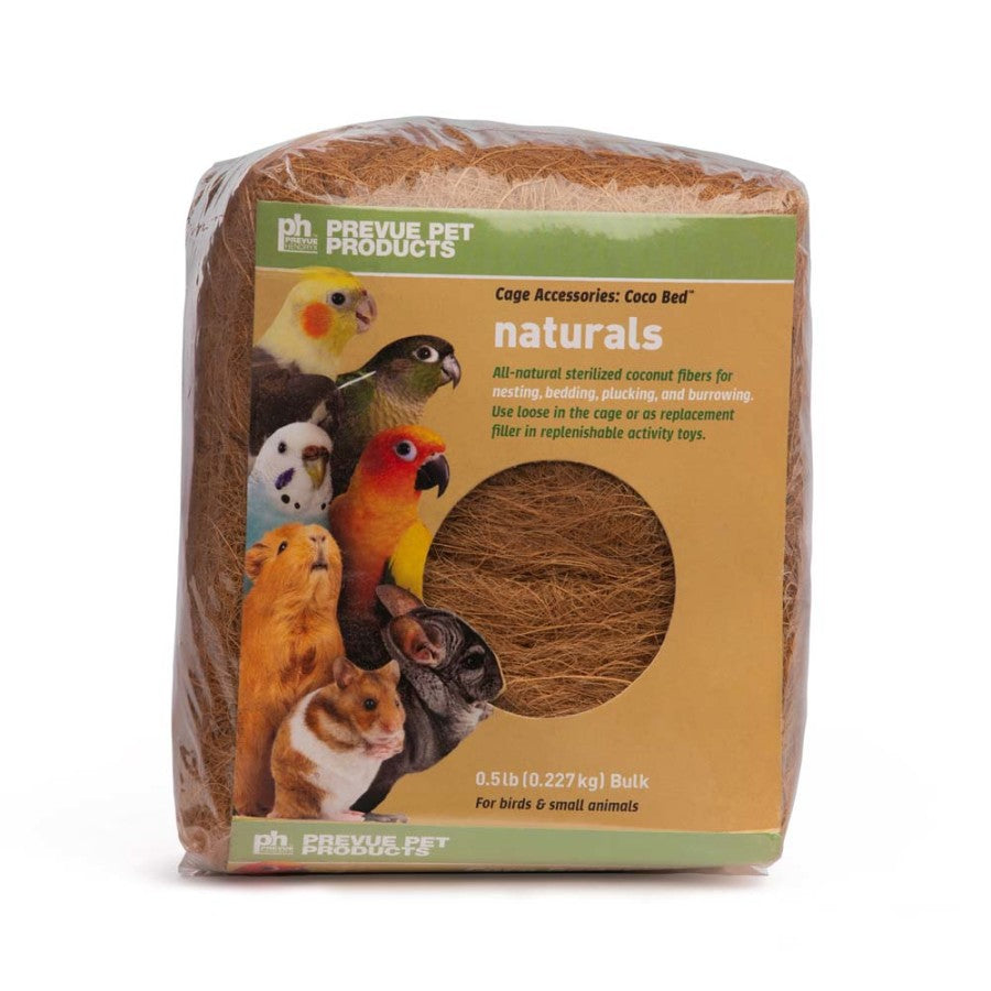 Prevue Pet Products Coco Bed Fibers 107 satisfies natural nest-building urges. This 100% natural dehydrated, sterilized coconut fiber satisfies plucking, preening, nesting, and foraging instincts. Package contains 1/2 lb (8 oz.) bulk bundle sterilized coconut fiber for nesting, replenishing toys, and bedding — ideal for X-Small, Small, Medium, Large-sized bird, X-large birds, and small animals.
