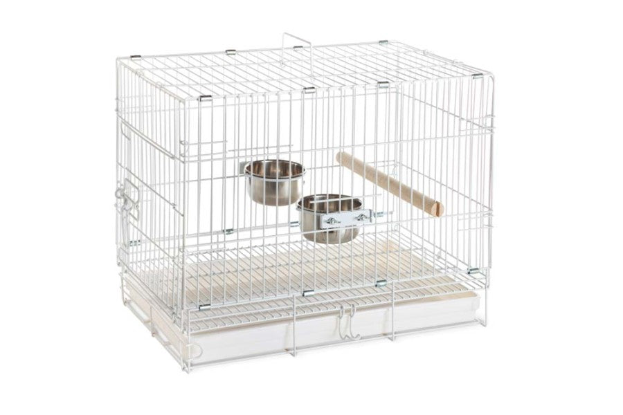 Prevue Pet Products Travel Cage is an ideal solution for short-term traveling. Perfect for small parrots the 9 x 9 side access door allows birds to walk right into the cage. A removable bottom grille and plastic pull out tray make cleaning effortless while storage is simple as you can fold the cage flat. Our Travel Cage is available in White only includes two stainless steel dishes plus one perch and measures 20x12x16with 3/4in wire spacing.