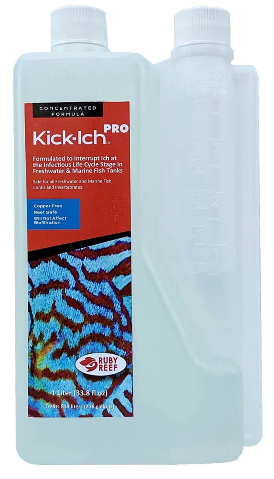 Kick-Ich PRO, for treatment of freshwater and marine ich. Reef safe and copper free. Safe for all fish, corals and invertebrates. Safe for Nitrosomonas, Nitrobacter and other bacteria essential for biofiltration.