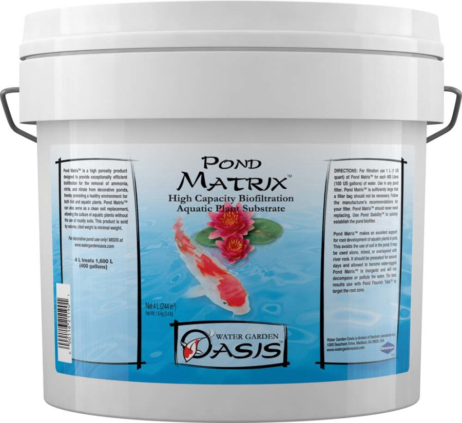 - Use Instructions: For filtration use 2 Liters of Pond Matrix for each 200 gallons of water. Use in any pond filter. Pond Matrix is sufficiently large that a filter bag should not be necessary. Follow the manufacturer's recommendations for your filter. Pond Matrix should never need replacing. Pond Matrix makes an excellent support for root development of aquatic plants and may be used directly on the bottom of the pond or in pots. This avoids the use of soil in the pond. It may be used alone, mixed, or overlayered with river rock. For pond bottom use, it should be presoaked for several days and allowed to become water-logged and sink (although a high current will disrupt it). Pond Matrix is inorganic and will not decompose or pollute the water.