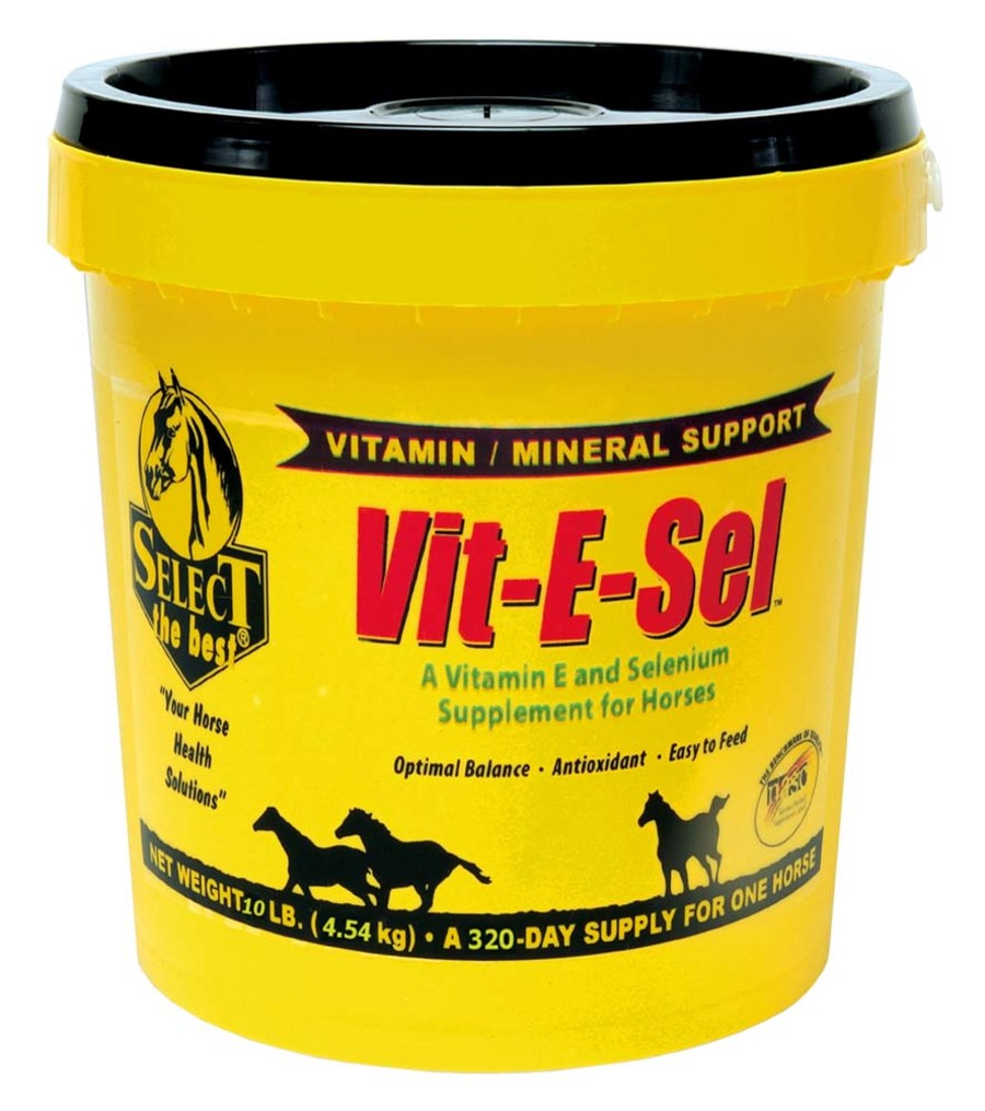 Vitamin E and Selenium are interrelated and function together as part of a multi-component system supporting a healthy horse. Vitamin E is an antioxidant and closely tied to Selenium. Selenium is also important to the prevention of White Muscle Disease in foals and Tying Up in mature horses. Parts of the United States are Selenium deficient, so find out if your feeding program needs additional supplementation with Vit-E-Sel.