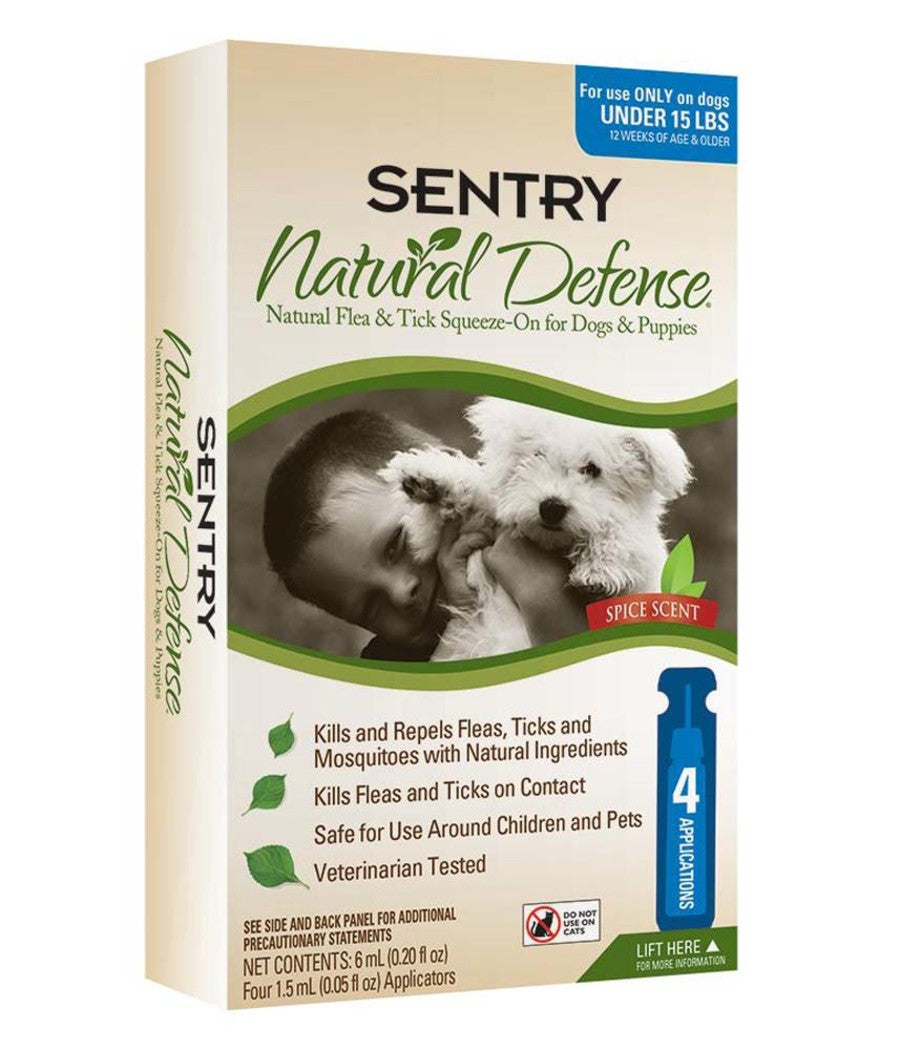SENTRY Natural Defense Natural Flea & Tick Squeeze-On for Dogs & Puppies kills fleas, ticks and mosquitoes for up to four weeks, yet it's safe to use on your dog or puppy and around your family when applied as directed. Each carton contains three monthly applications that feature natural active ingredients such as peppermint oil, cinnamon oil, lemon grass oil and thyme oil.