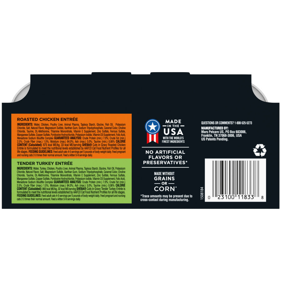 - Contains twelve (12) 2.6 oz. twin pack trays (24 servings total) of SHEBA Wet Cat Food Cuts in Gravy PERFECT PORTIONS Variety Pack: (6) Roasted Chicken Entree (6) Tender Turkey Entree