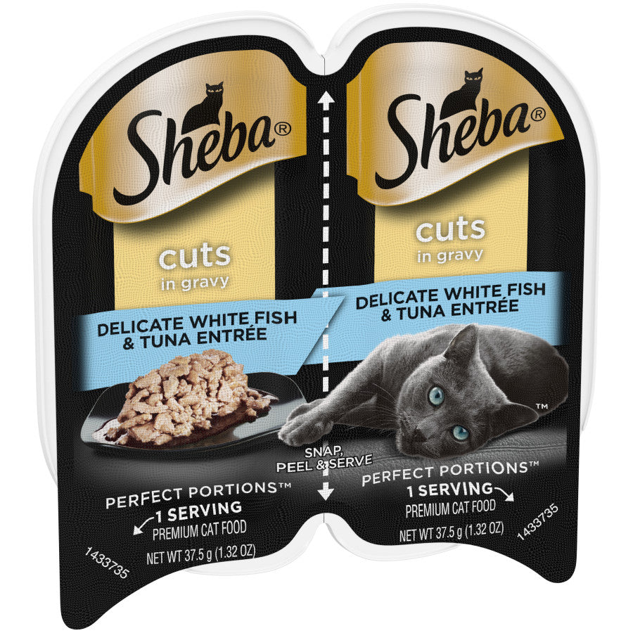 - Contains twenty-four (24) 2.6 oz. twin pack trays (48 servings total) of SHEBA Wet Cat Food Cuts in Gravy PERFECT PORTIONS, Delicate White Fish & Tuna Entree