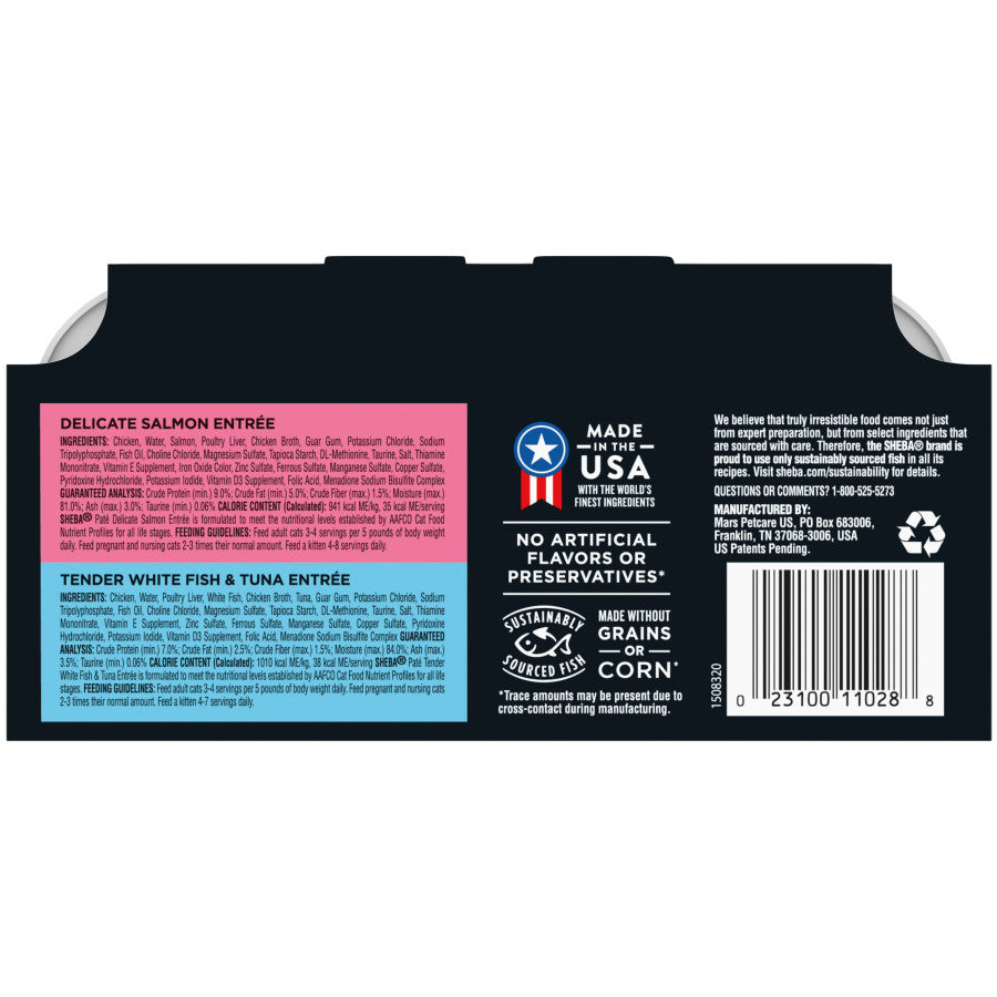 - Contains twelve (12) 2.6 oz. PERFECT PORTIONS twin pack trays (24 servings total) of SHEBA Wet Cat Food Pate Variety Pack: (6) Delicate Salmon Entree, (6) Tender Whitefish & Tuna Entree