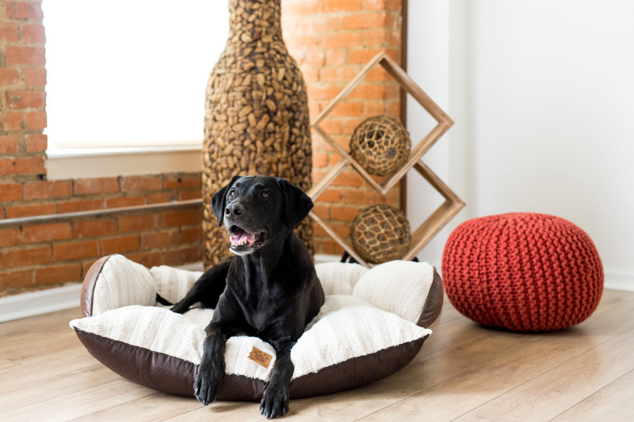 Give your pet a comfortable, warm place to snooze with a SnooZZy's Rustic Luxury Comfy Couch Pet Bed. Designed like a piece of furniture, the SnooZZy Comfy Couch features a sofa silhouette with supportive bolsters on three sides for a dog to rest their head on or cuddle up to and keep warm. A soft, cream-colored sculpted plush fabric covers the entire sleep surface, while the outer part of the bed is wrapped in a dark brown, faux leather that adds warmth to any room in a home. Ideal for medium to large-sized dogs who like to stretch out or curl up while they snooze. As a dog gets in and out of the bed, the non-skid bottom keeps the bed in place on any floor type. To keep a dog's area fresh, a removable outer cover is machine washable.