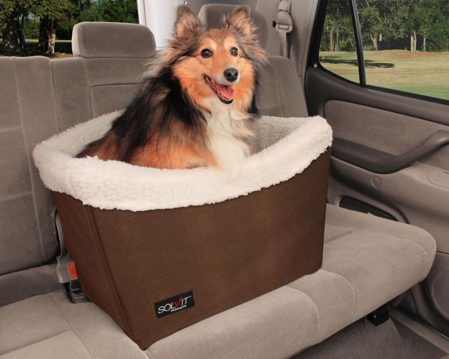 For 2014, the Jumbo On-Seat Booster has been upgraded and re-named Pet Safety Seat. The addition of a crash-tested safety tether, which integrates with the vehicle seat belt system, makes it tops in safety in the booster seat category. The Pet Safety Seat cradles pets in comfort and security as they cruise along. The unique design utilizes Safe-T-Core technology, a system of molded panels that fasten together permanently, creating a lightweight, yet super-strong structure, tested to 175 lbs. Installs securely in one minute in either front or back seat. A roomy, fully padded interior gives pets up to 30 lbs room to relax and is perfect for multiple pets. The inside basket dimensions are 18 inches wide by 14 inches deep at bottom, 19.5 inches wide by 14.5 inches deep at top, and the sides are 8 inches tall. The outside dimensions of the entire unit are 22 inches wide by 17 inches tall by 17 inches deep. The inside floor of the basket is nine inches above the vehicle seat so pets can easily see out while traveling. Unlike foam-based booster seats, the On-Seat Booster will not trap odors ñ cleans easily to stay looking and smelling fresh. Adjustable safety leash included. Quilted polyester with sheepskin liner. Lifetime Warranty against defects in materials and workmanship. Weighs 7 lbs