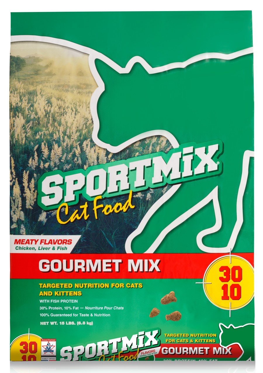 Sportmix Gourmet Mix Cat Food combines chicken, liver and fish flavored pieces to produce a taste that cats love. Formulated with a special balance of protein, fat, vitamins and minerals, Gourmet Mix Cat Food supplies a 100% complete and balanced diet.