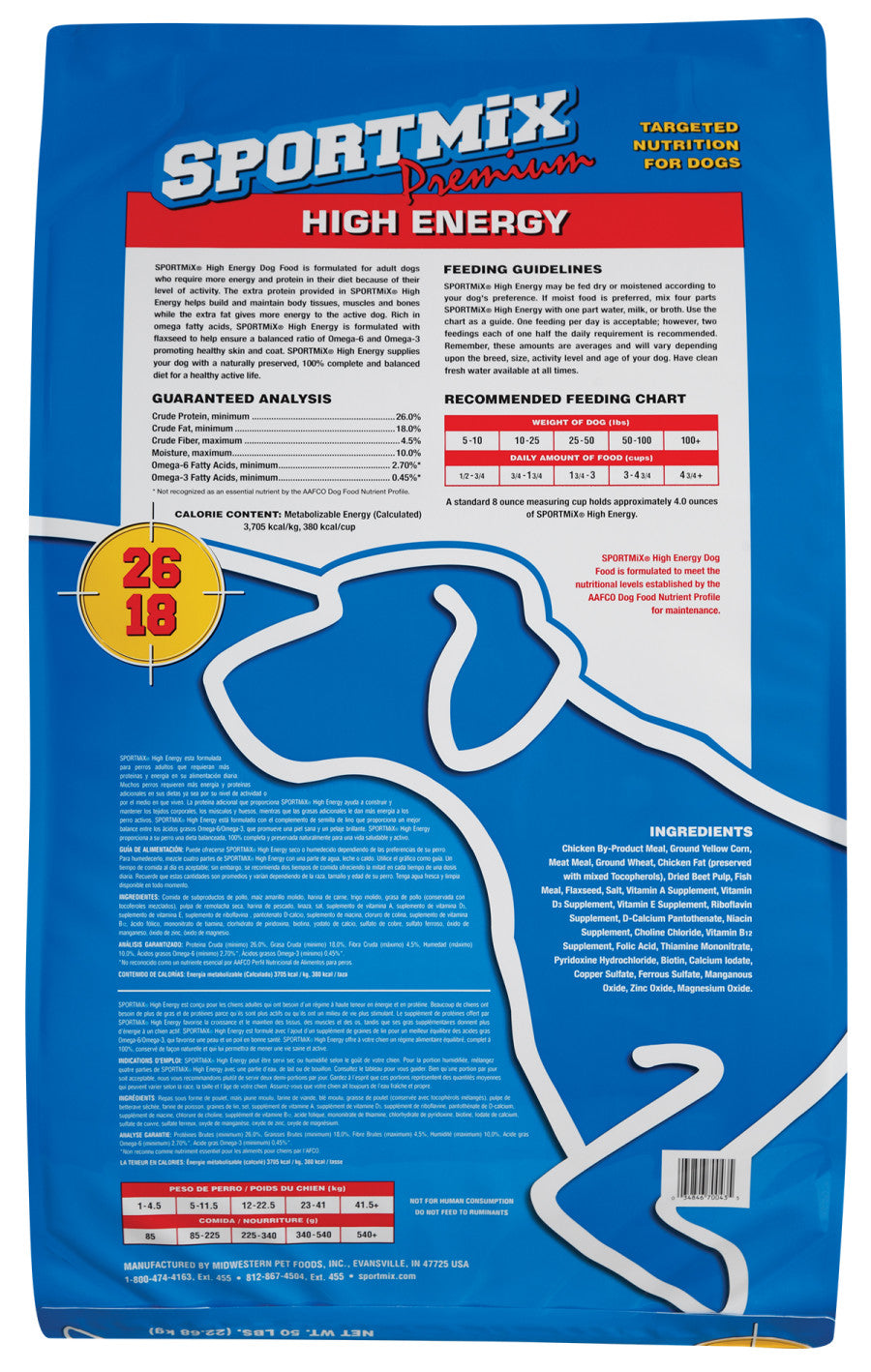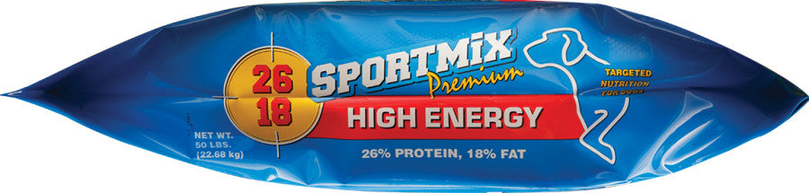 SPORTMiX® High Energy Adult Mini Chunk 26/18 is formulated for adult dogs who require extra protein and fat in their diet due to their level of activity or living environment. SPORTMiX® High Energy Adult Mini Chunk is formulated with supplemental flaxseed which helps ensure an improved Omega-6/Omega-3 fatty acid balance, promoting healthy skin and coat. SPORTMiX® High Energy Adult Mini Chunk is formulated to meet the nutrition levels established by the AAFCO Dog Food Nutrient Profiles for maintenance. Available in 55, 50, 40 and 16.5 lb. bags.