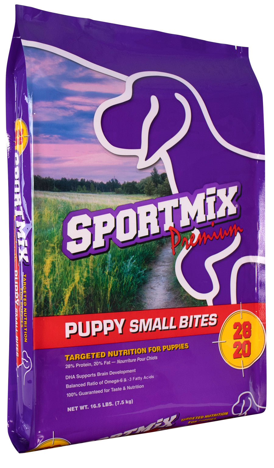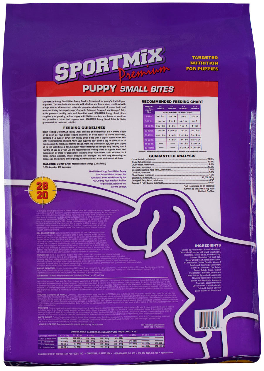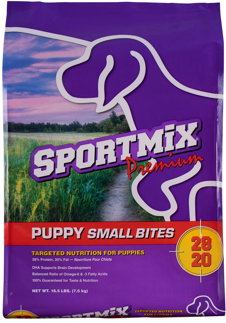 SPORTMiX® Puppy Small Bites 28/20 is formulated for puppy's first full year of growth. This nutrient-rich formula with chicken and fish protein, combined with a high level of vitamins and minerals, promotes development of bones, teeth and muscles during this rapid stage of growth. Balanced Omega-6 and Omega-3 fatty acids promote healthy skin and beautiful coat. SPORTMiX® Puppy Small Bites supplies your growing, active puppy with 100% complete and balanced nutrition and provides a taste that puppies love. SPORTMiX® Puppy Small Bites is naturally preserved and 100% guaranteed for taste and nutrition. SPORTMiX® Puppy Small Bites Puppy Food is formulated to meet the nutritional levels established by the AAFCO Dog Food Nutrient Profiles for lactation/gestation and growth of dogs. Available in 33 and 16.5 lb. bags.