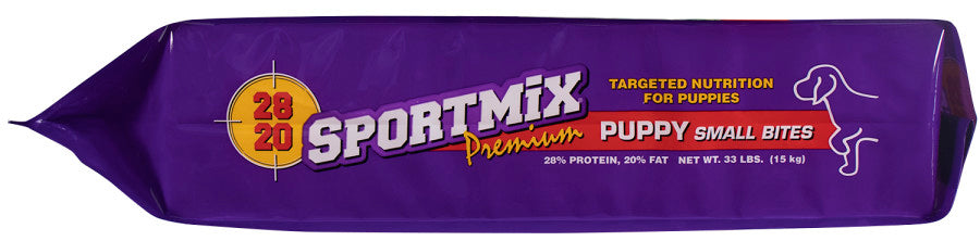 SPORTMiX® Puppy Small Bites 28/20 is formulated for puppy's first full year of growth. This nutrient-rich formula with chicken and fish protein, combined with a high level of vitamins and minerals, promotes development of bones, teeth and muscles during this rapid stage of growth. Balanced Omega-6 and Omega-3 fatty acids promote healthy skin and beautiful coat. SPORTMiX® Puppy Small Bites supplies your growing, active puppy with 100% complete and balanced nutrition and provides a taste that puppies love. SPORTMiX® Puppy Small Bites is naturally preserved and 100% guaranteed for taste and nutrition. SPORTMiX® Puppy Small Bites Puppy Food is formulated to meet the nutritional levels established by the AAFCO Dog Food Nutrient Profiles for lactation/gestation and growth of dogs. Available in 33 and 16.5 lb. bags.