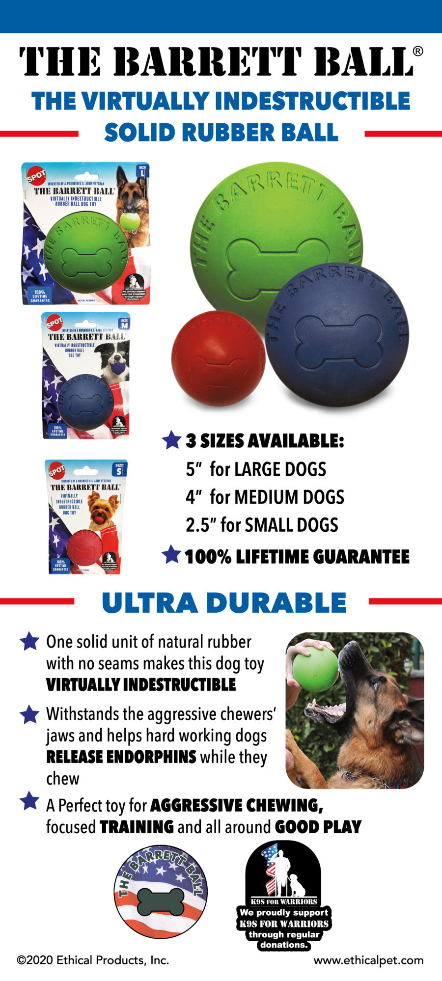 The Barret Ball was created by USA war veteran, James Hayes, and named after his service dog Barrett. These solid rubber balls are virtually indestructible and have a 100% Lifetime Guarantee. All profits donated to Dogs4Warriors. Patent Pending.