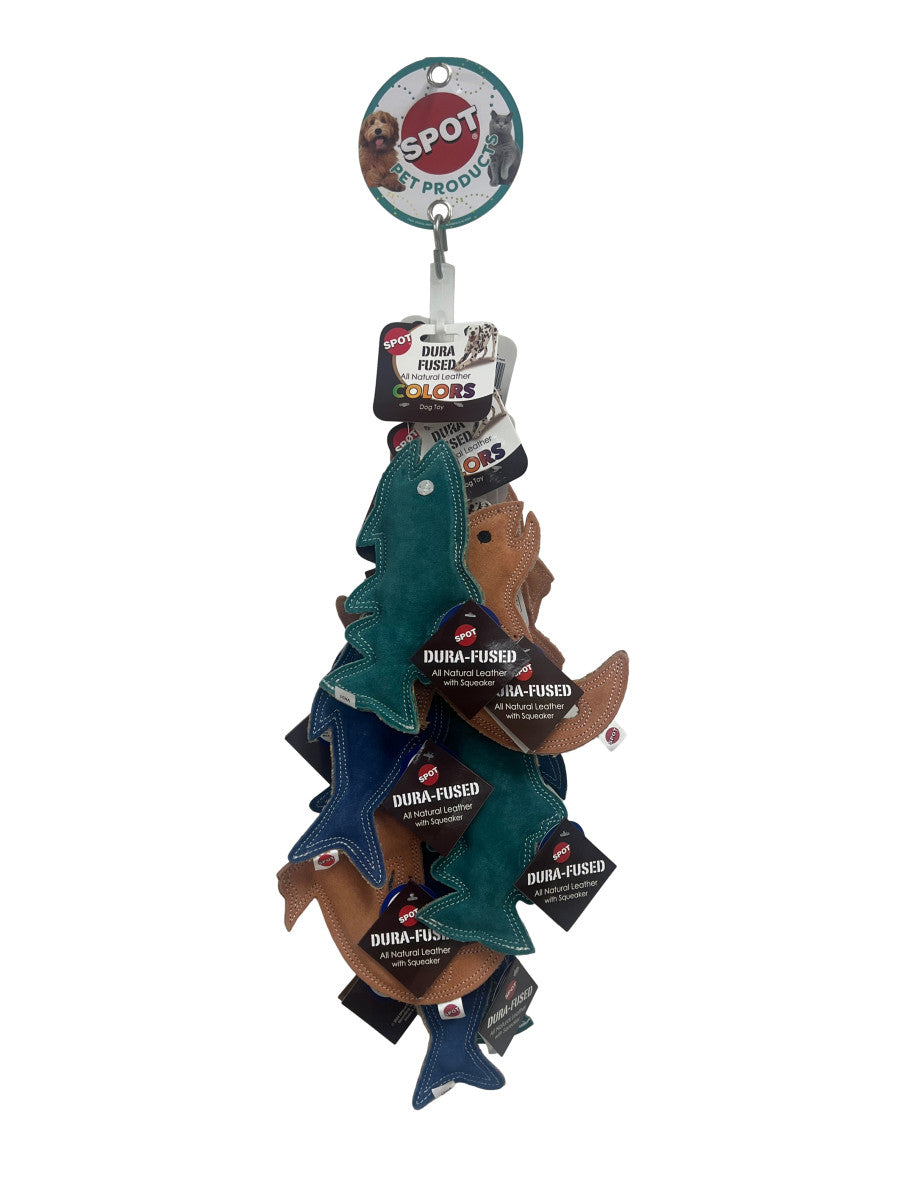 Dura-Fused Leather toys will be your dog's favorite. Super durable leather and jute fabric fused together for added strength. Double stitched seams with heavy duty thread add X-durability. Made from real leather, fully stuffed and a squeaker for even more fun. The 12 piece clip strip contains 12 of #54804 Dura-Fuse Leather Fish 7 assorted
