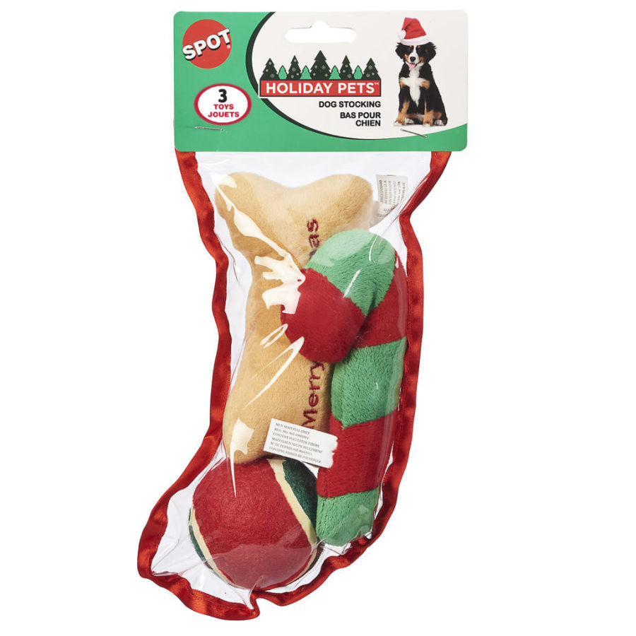 Holiday themed dog toys in a convenient festive stocking. 5 piece assortment