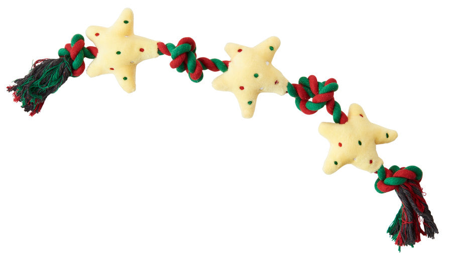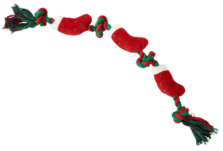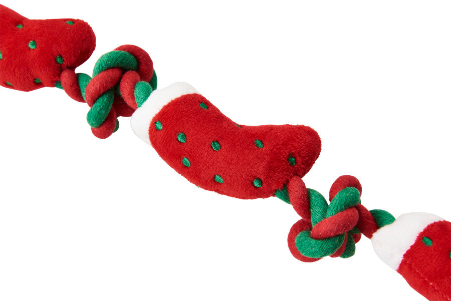 Holiday themed rope tugs. 2 color knotted durable rope with 3 plush toys between knots.