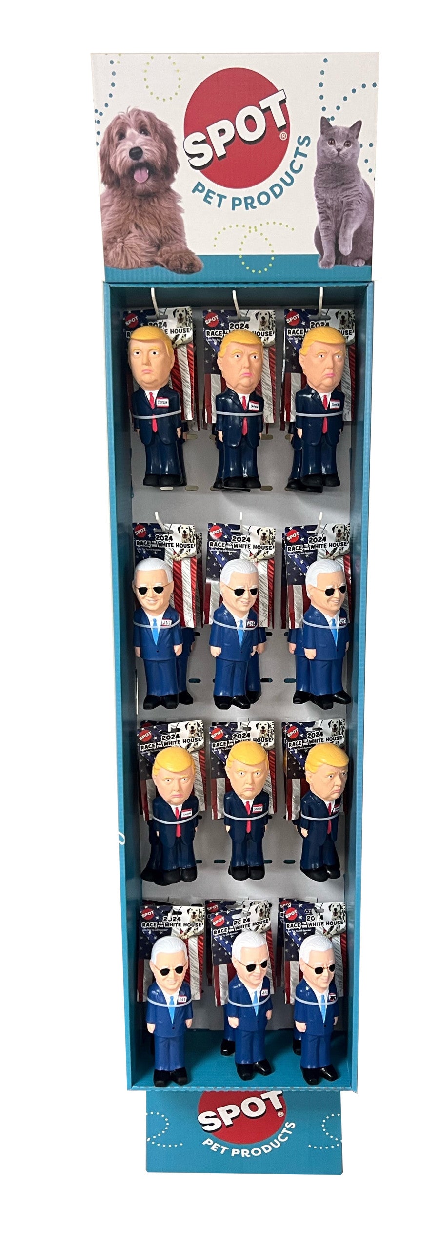 It's a race to the White House with our paw-litical candidates. Durable latex dog toys parody characters offer your dog a soft and satisfying chew toy. Built in squeaker will keep them excited to play. Let your dog decide on the best candidate for 2024! The 24 piece power wing contains 12 of #54837 Latex Candidate 8.5 Joe and 12 of Latex Candidate 8.5 Donald.