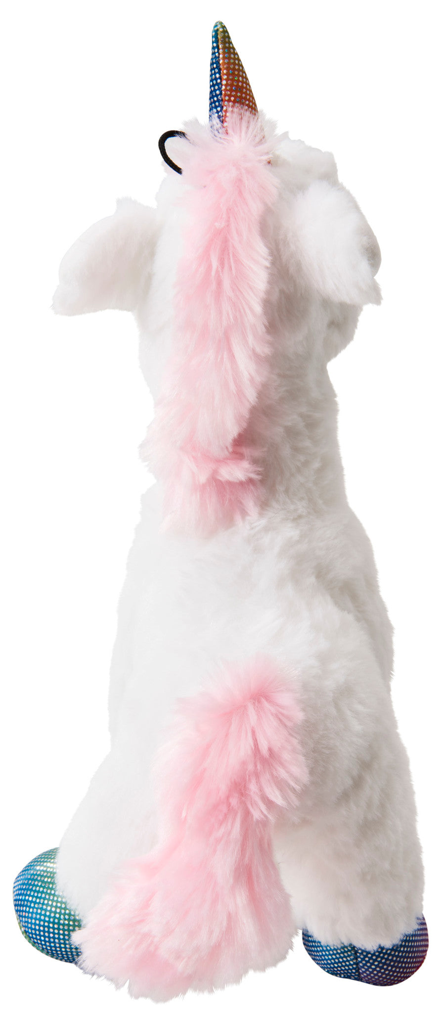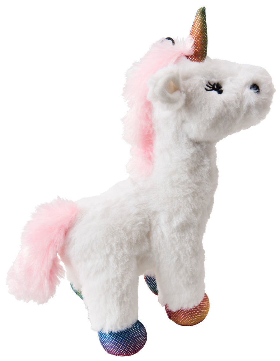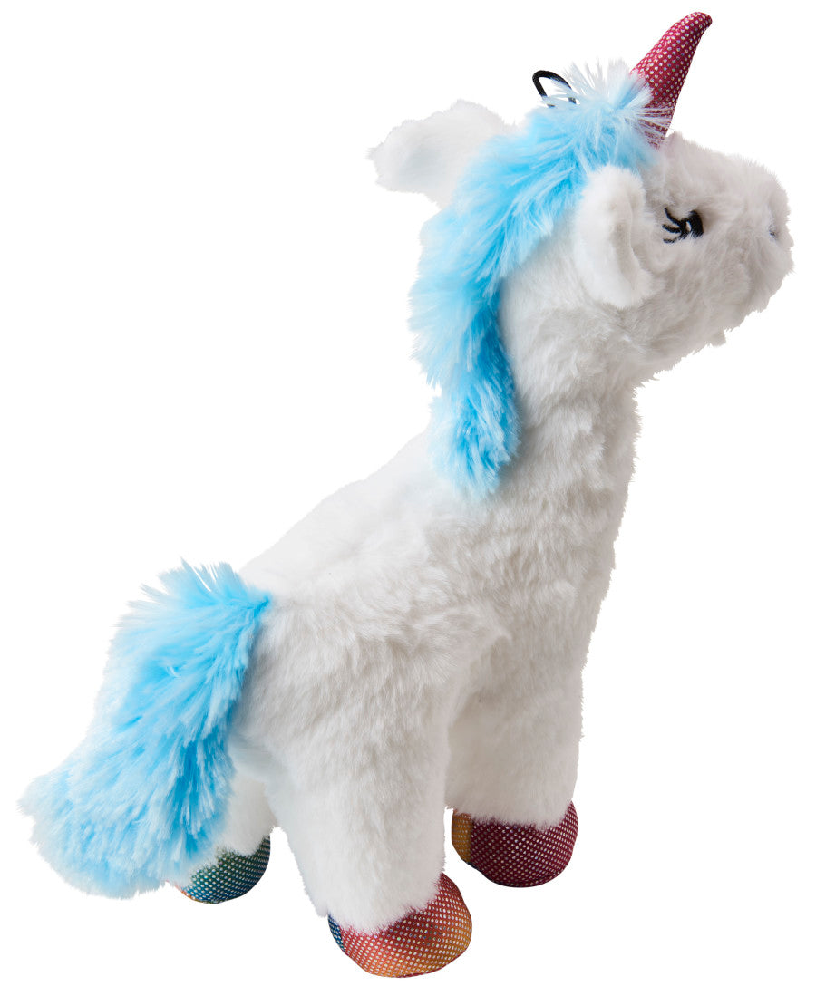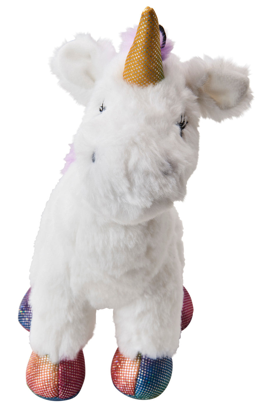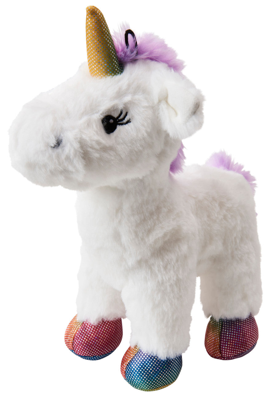 Rainbow colored unicorn assortment. Shimmer fabric hooves and horn. Long pile plush mane and tail. Super soft plush body. Squeaker for added fun.