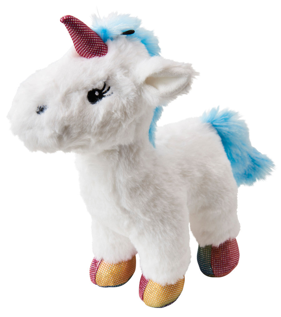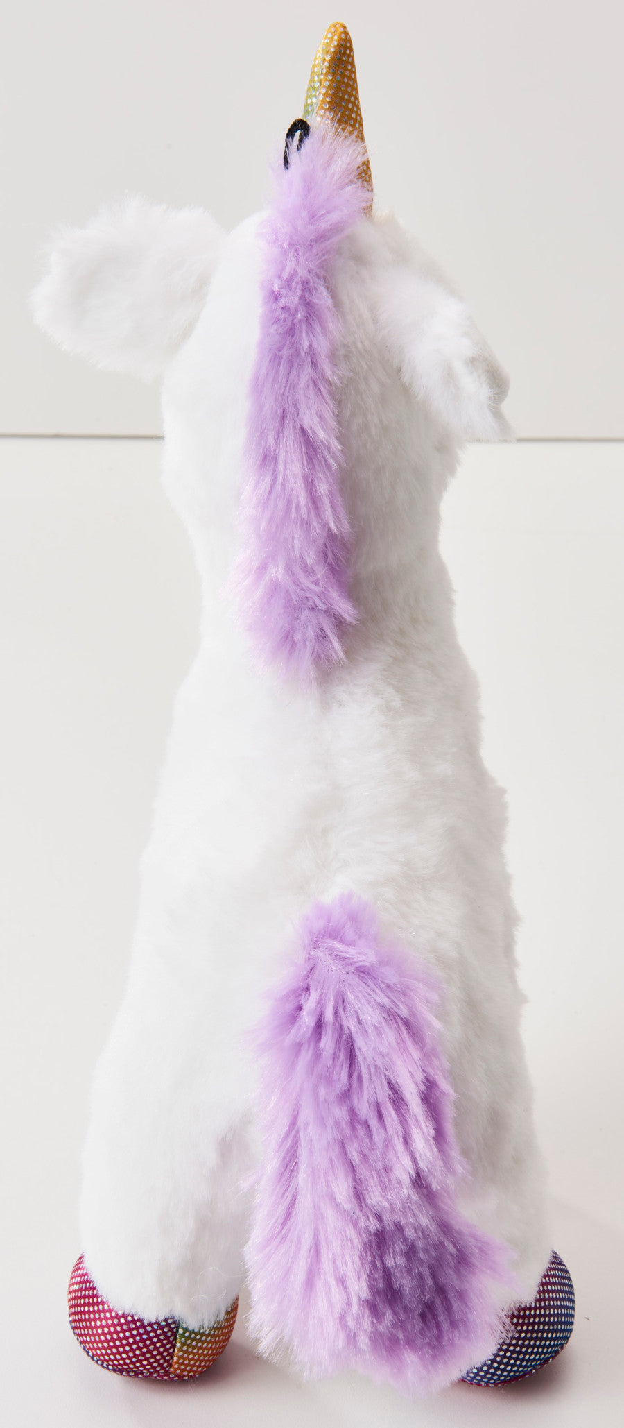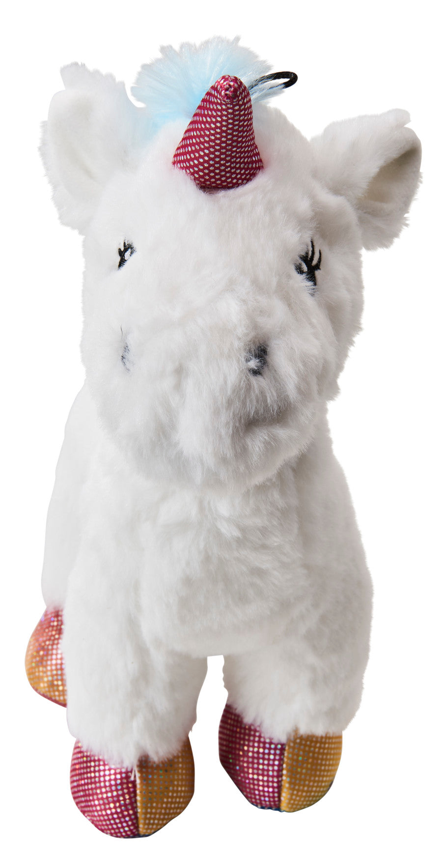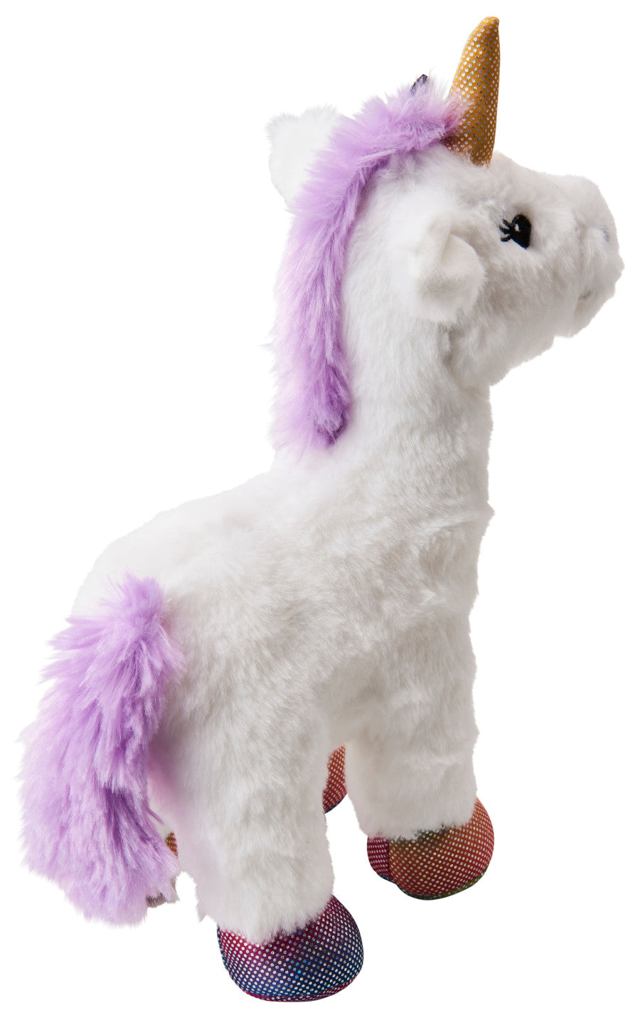 Rainbow colored unicorn assortment. Shimmer fabric hooves and horn. Long pile plush mane and tail. Super soft plush body. Squeaker for added fun.