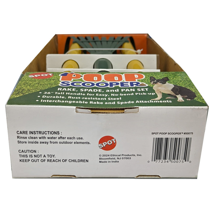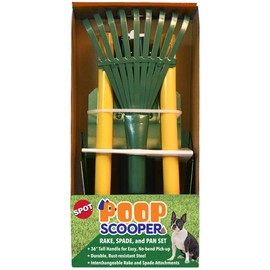 The Spot Poop Scooper makes picking up after your dog quick and sanitary. The Poop Scooper allows you to conveniently remove outdoor waste without bending down and grabbing it. The set is 36 in height, made with mild steel powder coated metals and is durable/rust resistant. Easy to assemble. Includes rake, spade and 7 scoop pan.